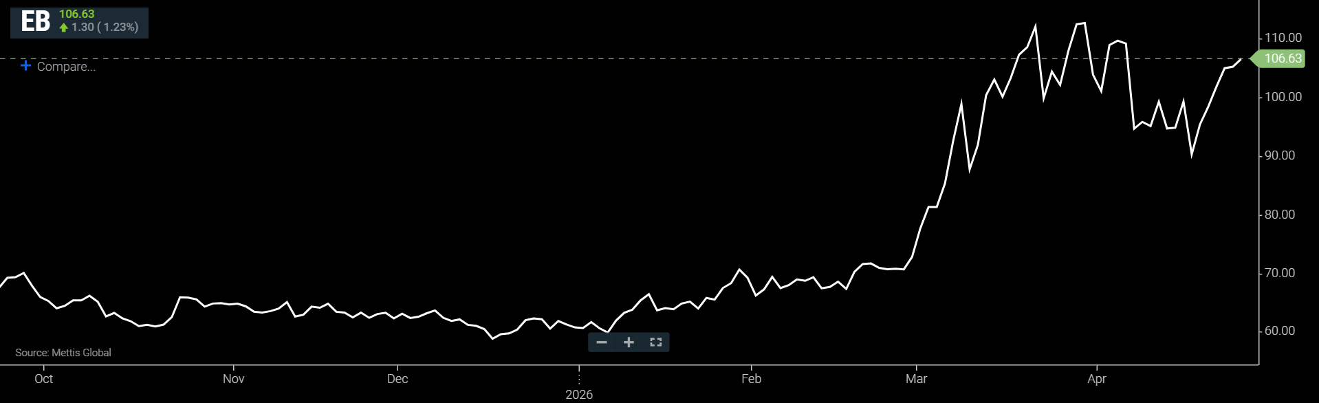 to $106.63 per barrel, according to data by Mettis Global.