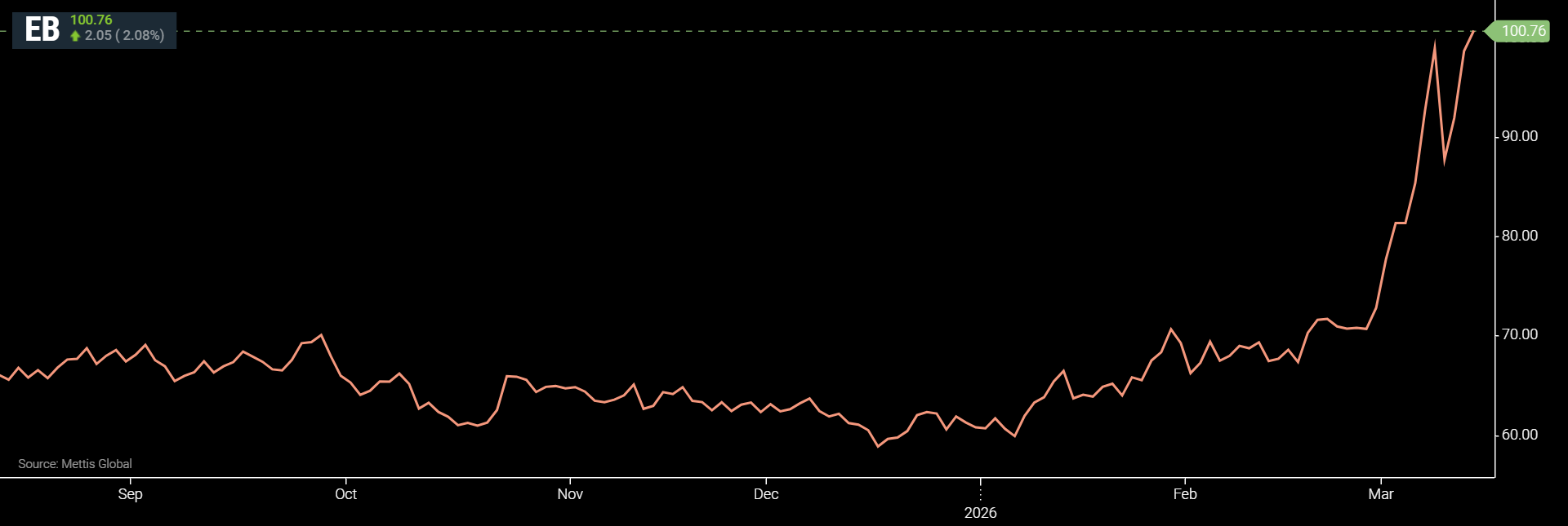 to $100.76 per barrel, according to data by Mettis Global.