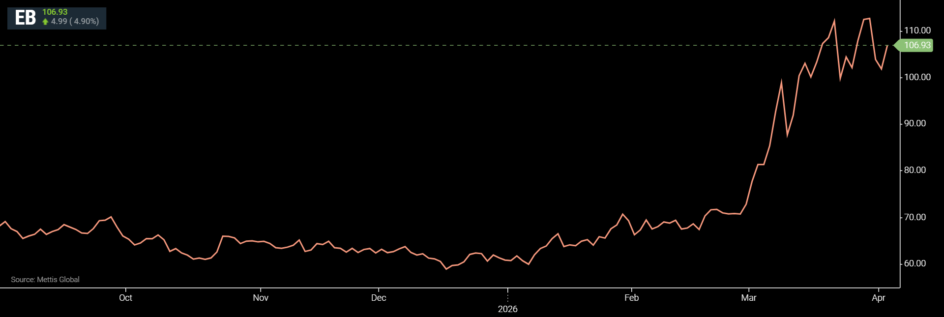 to $106.93 per barrel, according to data by Mettis Global.