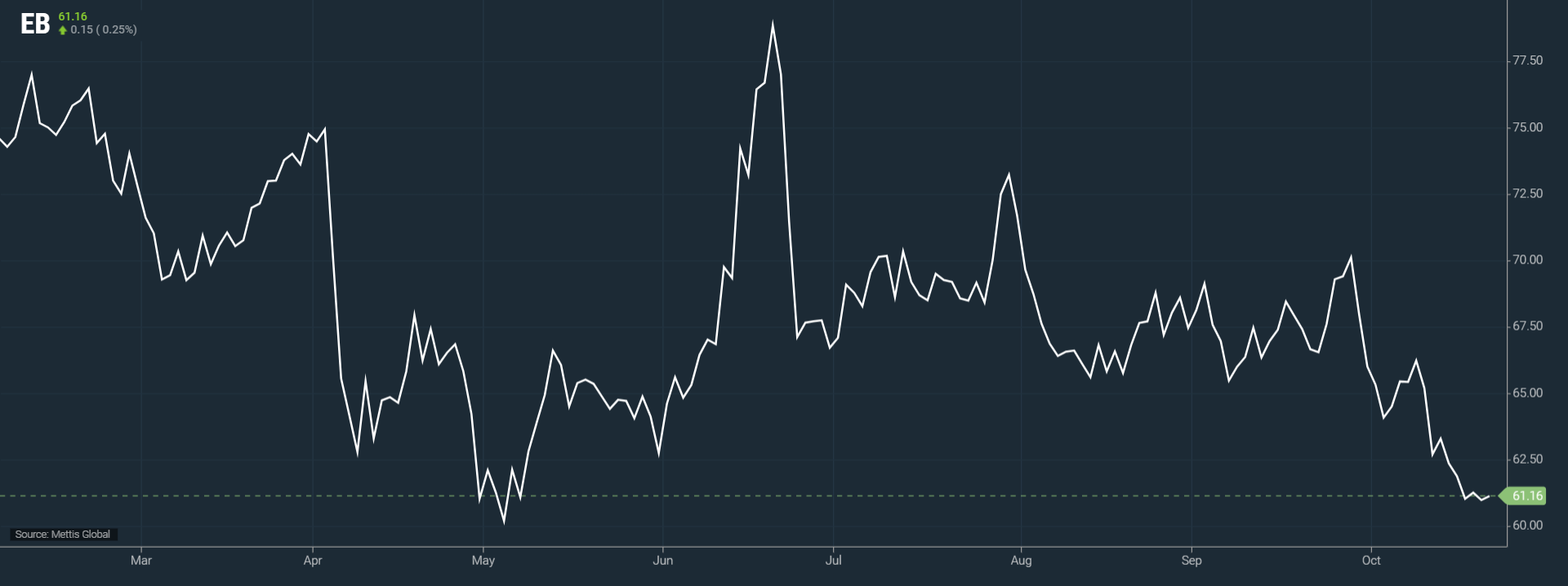 BRENT CRUDE | 60.75 | 61.20 60.58 | -0.26 -0.43% |