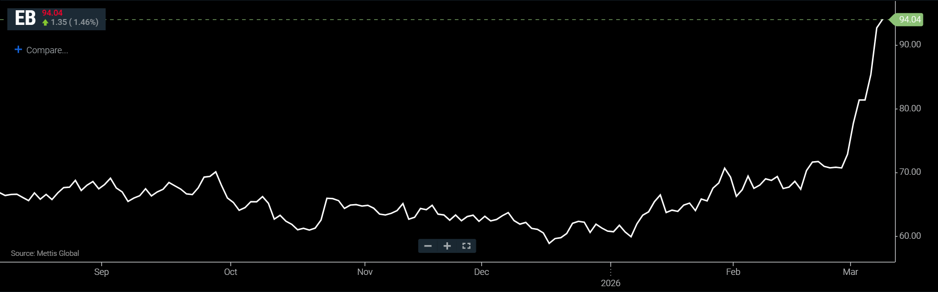 Currently, Brent crude futures is at $94.04 per barrel, according to Mettis Global data.