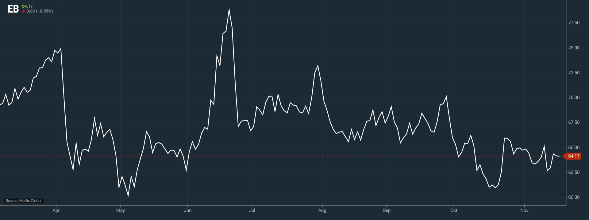 | BRENT CRUDE | 64.09 | 64.29 63.62 | -0.11 -0.17% |