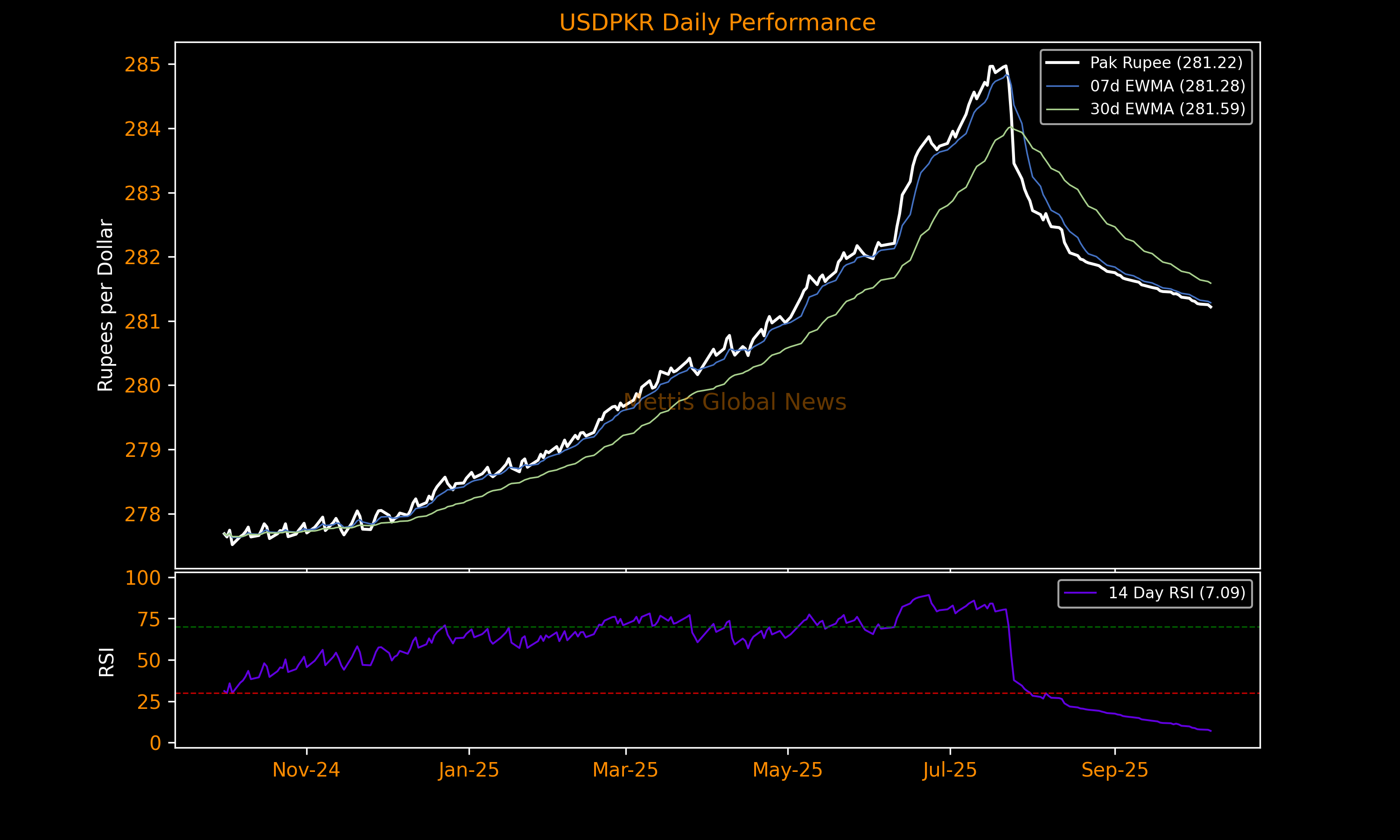 October 07, 2025 (MLN): The Pakistani rupee (PKR) strengthened by 3.51 paisa or 0.01% against the US dollar in Tuesday's interbank session to settle the trade at PKR 281.22 per USD, compared to previous closing of 281.25.