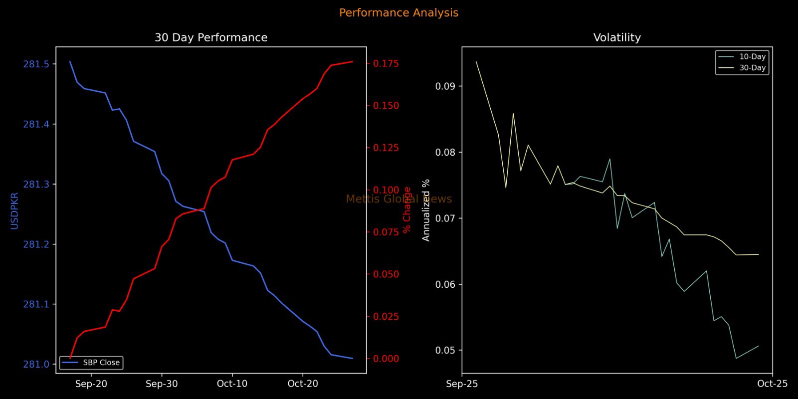 During the current fiscal year, PKR has appreciated against the US Dollar by 2.76 rupees or 0.98%. While it has weakened 2.46 rupees or 0.88% so far this calendar year.