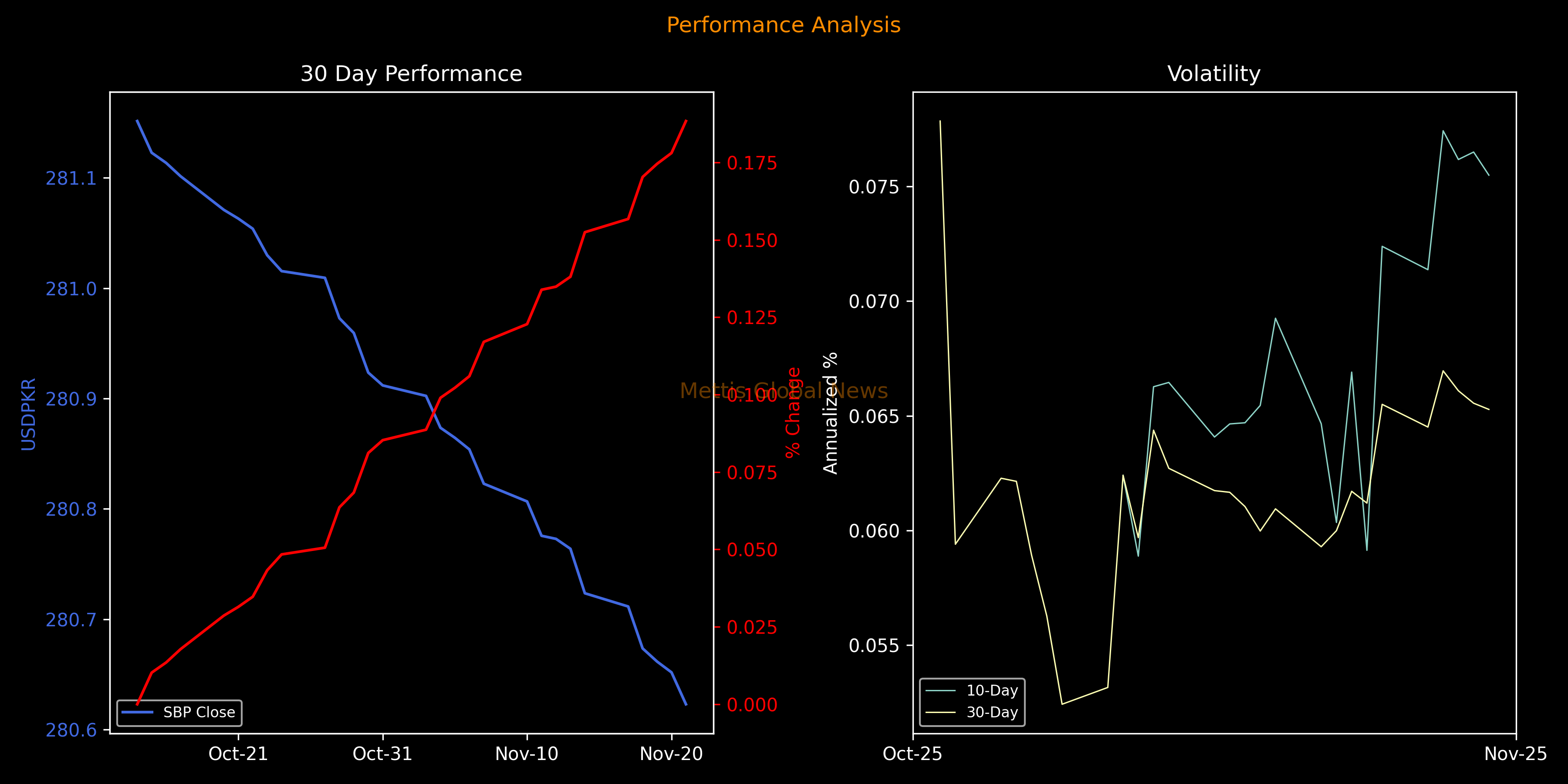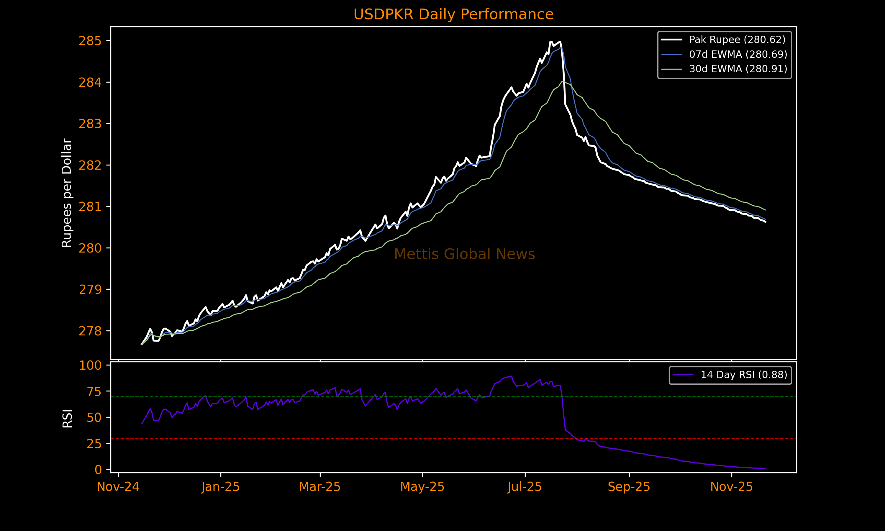 November 21, 2025 (MLN): The Pakistani rupee (PKR) gained by 2.89 paisa against the US dollar in Friday's interbank session to settle the trade at PKR 280.62 per USD, compared to previous closing of 280.65.
