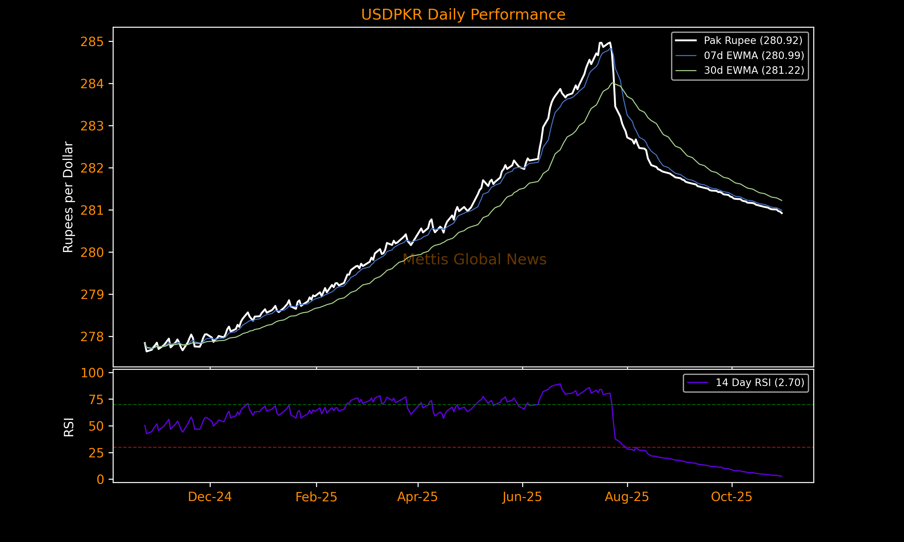 October 30, 2025 (MLN): The Pakistani rupee (PKR) appreciated by 3.59 paisa against the US dollar in Thursday's interbank session to settle the trade at PKR 280.92 per USD, compared to previous closing of 280.96.