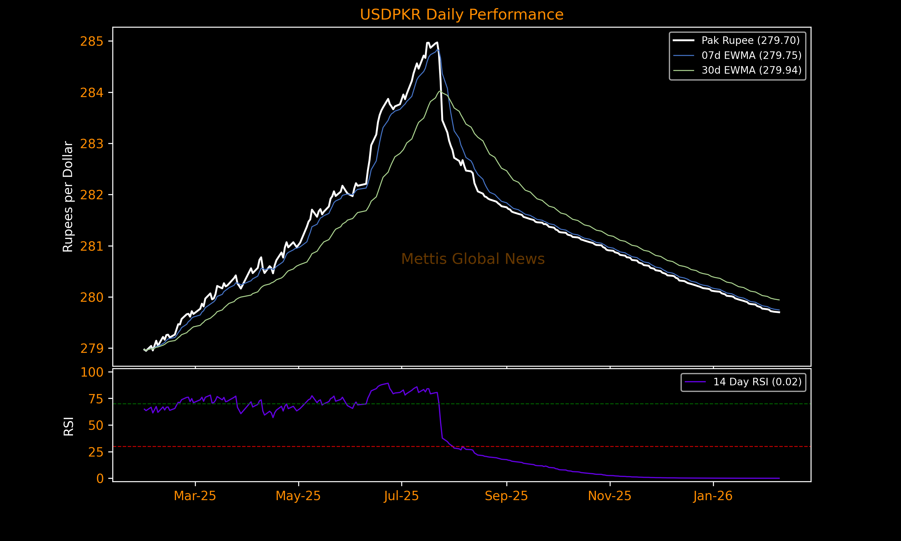 February 09, 2026 (MLN): The Pakistani rupee (PKR) appreciated by 0.98 paisa against the US dollar in Monday's interbank session to settle the trade at PKR 279.70 per USD, compared to previous closing of 279.71.