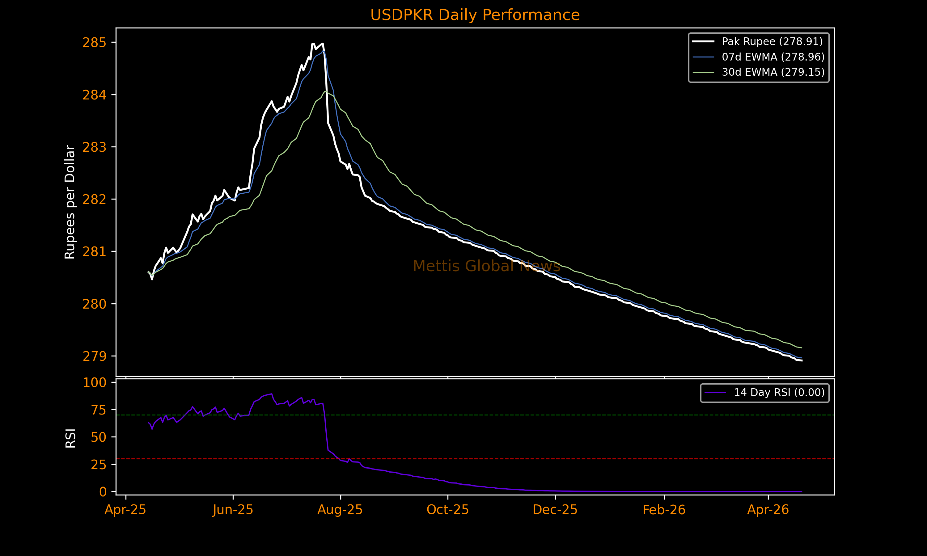 April 20, 2026 (MLN): Pakistani rupee (PKR) recorded a modest appreciation against the US Dollar in Monday’s interbank session, gaining 1.1 paisa to settle at 278.91 compared to the previous close of 278.92.