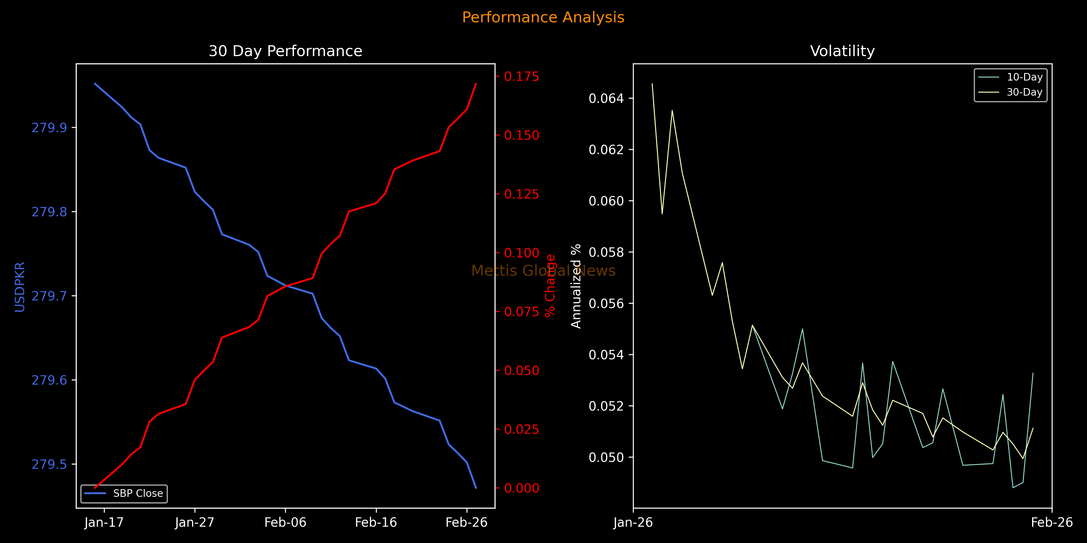 February 27, 2026 (MLN): The Pakistani rupee (PKR) posted a marginal gain against the United States dollar in Friday’s interbank trading, appreciating by 3.02 paisa, to close at 279.47 per dollar compared to the previous session’s close of 279.50.