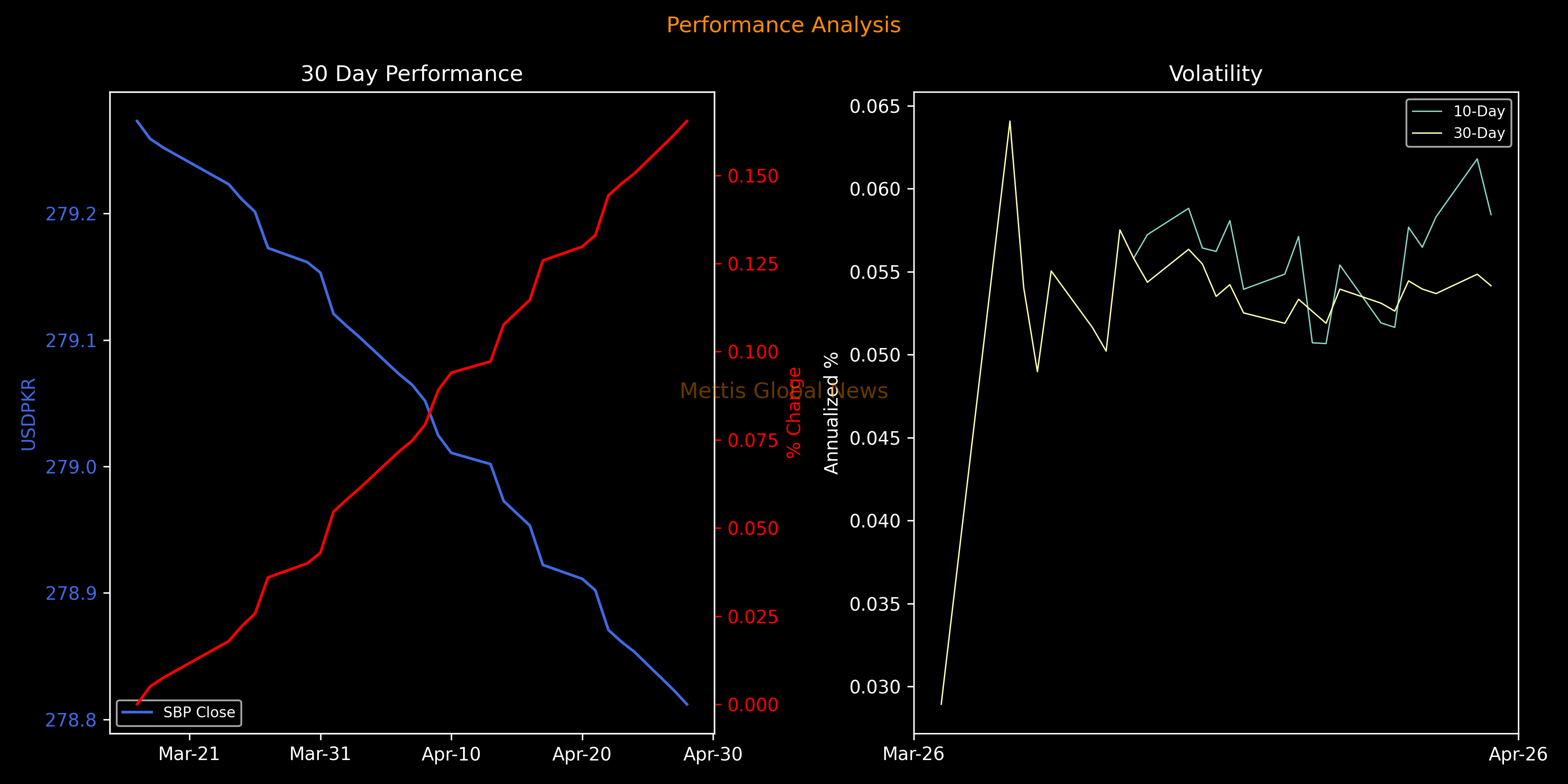 April 28, 2026 (MLN): The Pakistani Rupee posted a marginal gain against the US Dollar on Tuesday, appreciating by 1.11 paisa in the interbank market to close at PKR 278.81 per USD, compared to the previous session’s closing of 278.82.