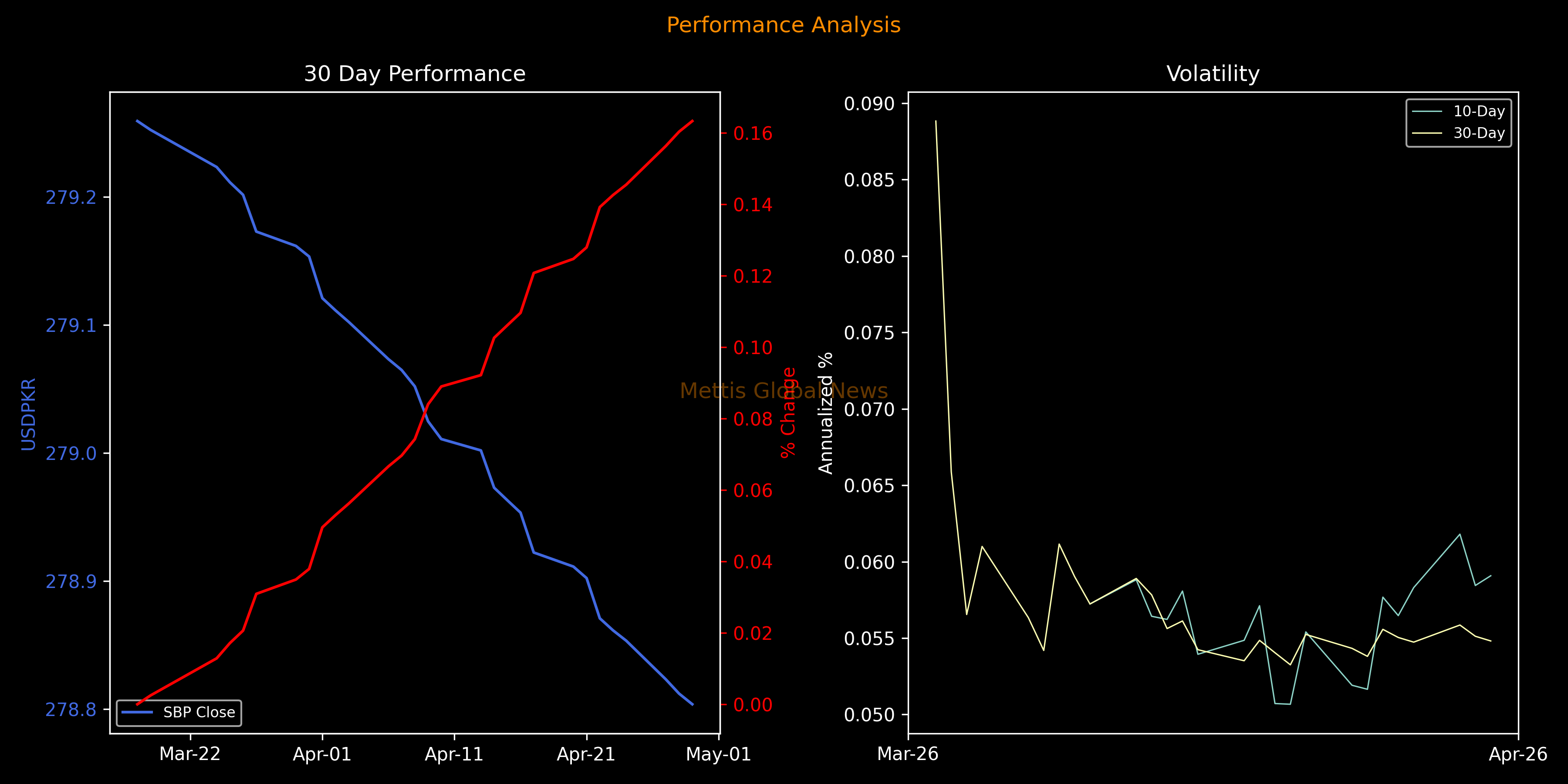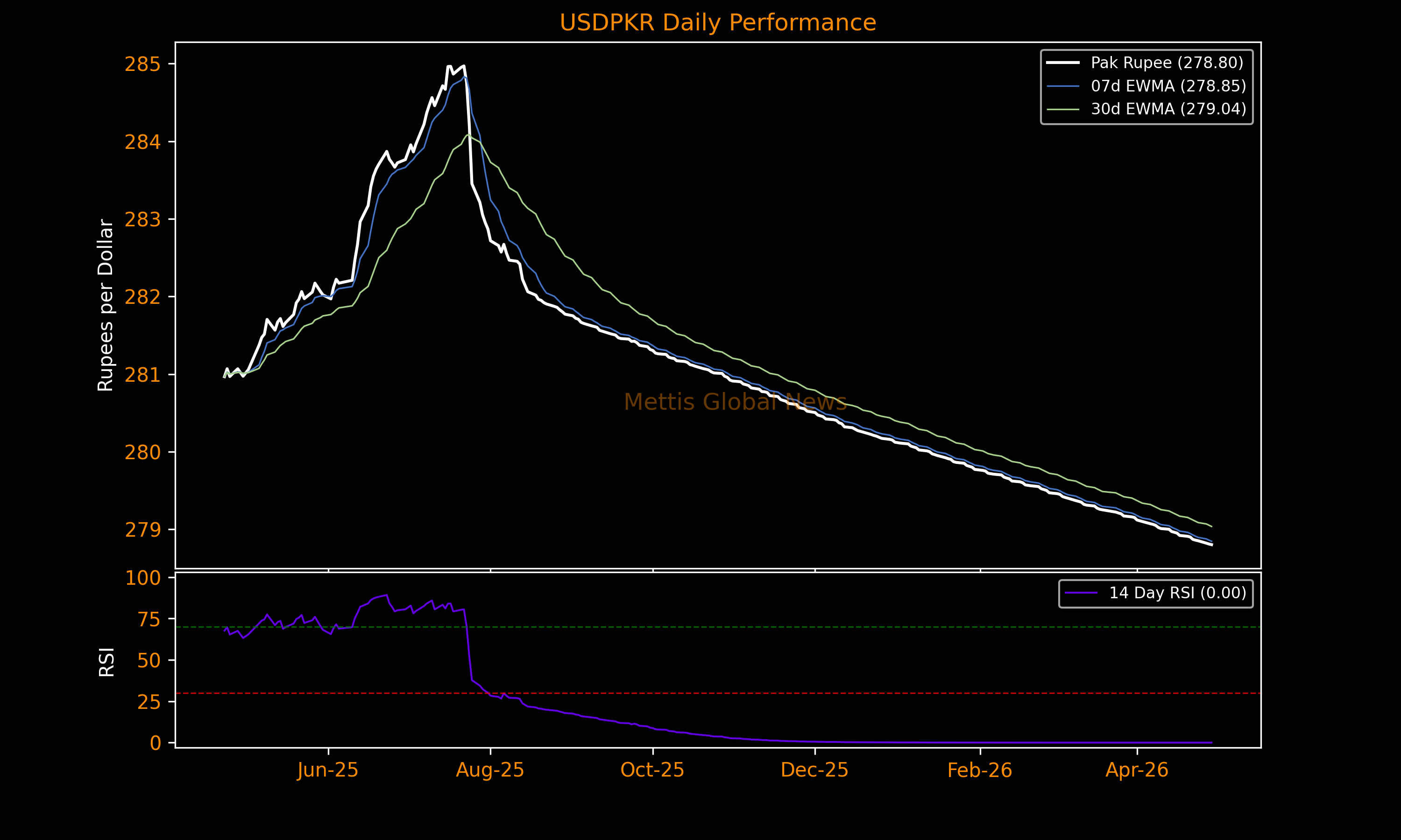 April 29, 2026 (MLN): The Pakistani rupee (PKR) recorded a marginal appreciation against the US dollar in Wednesday’s interbank foreign exchange session, gaining 0.83 paisa to close at PKR 278.80 per USD compared to the previous day’s closing level of 278.81.
