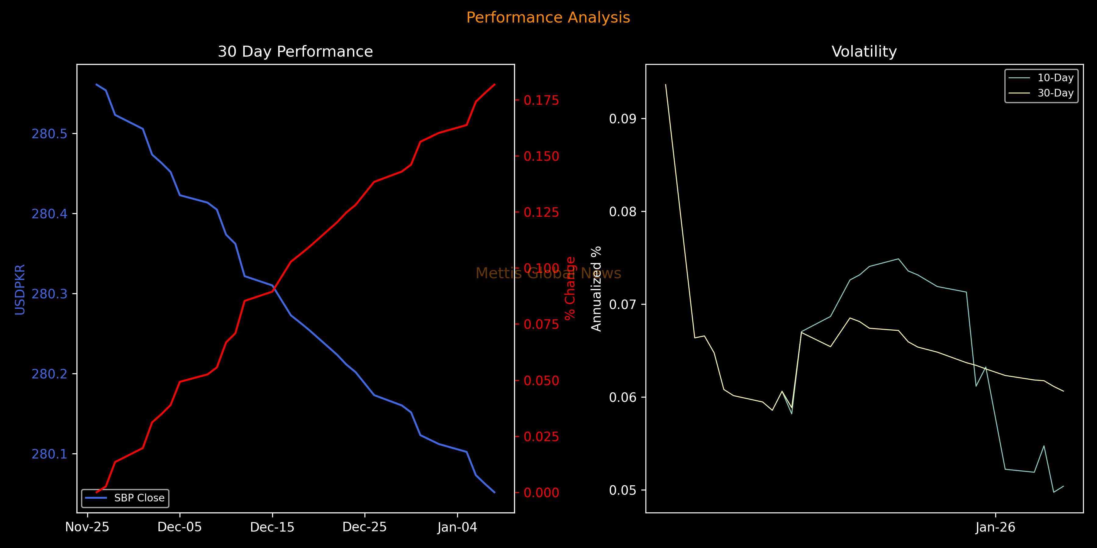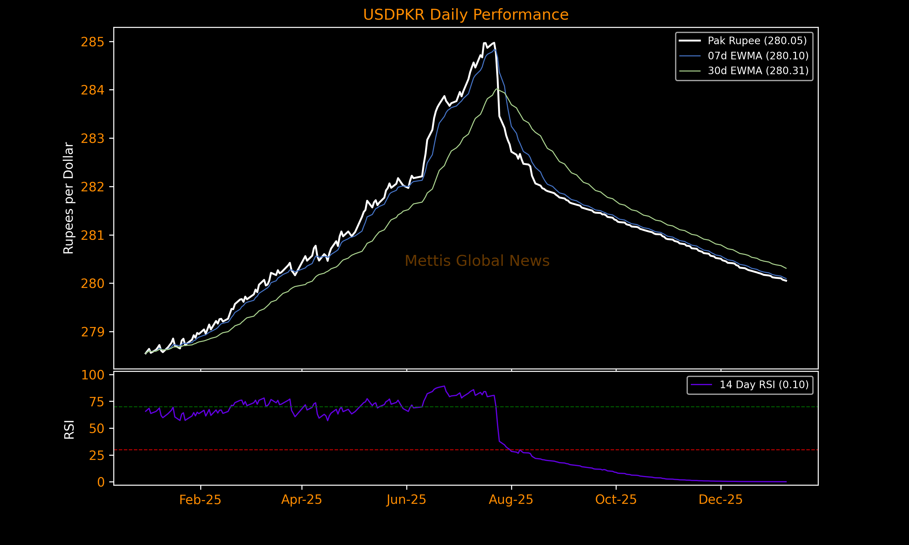 January 08, 2026 (MLN): The Pakistani rupee (PKR) remained mostly flat with a slight rise by 1.03 paisa against the US dollar in Thursday's interbank session to settle the trade at PKR 280.05 per USD, compared to previous closing of 280.06.
