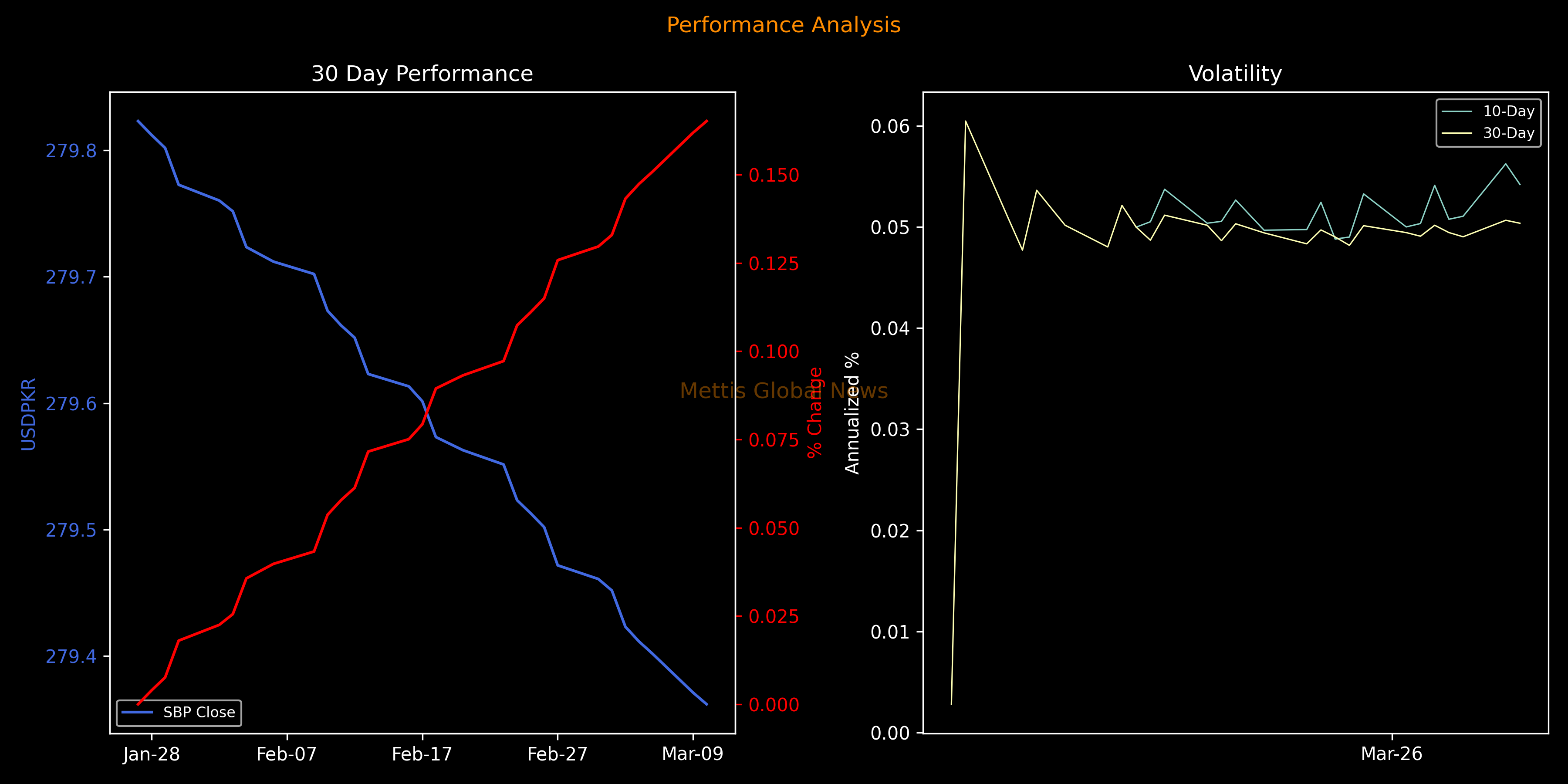 March 10, 2026 (MLN): The Pakistani rupee (PKR) recorded a marginal gain of 0.92 paisa against the US dollar during Tuesday’s interbank trading, closing at PKR 279.36 per USD compared to the previous session’s closing of 279.37.