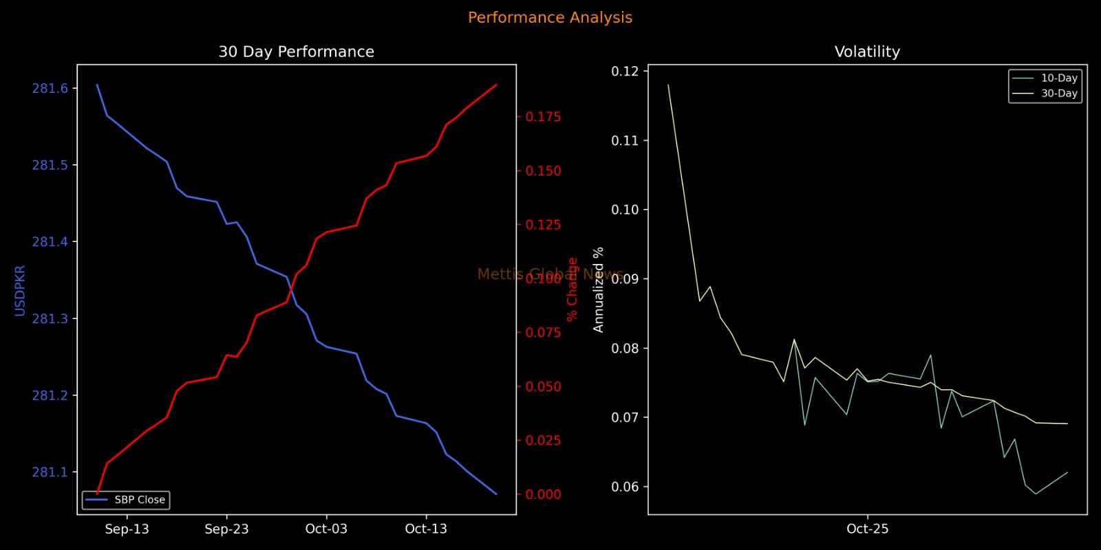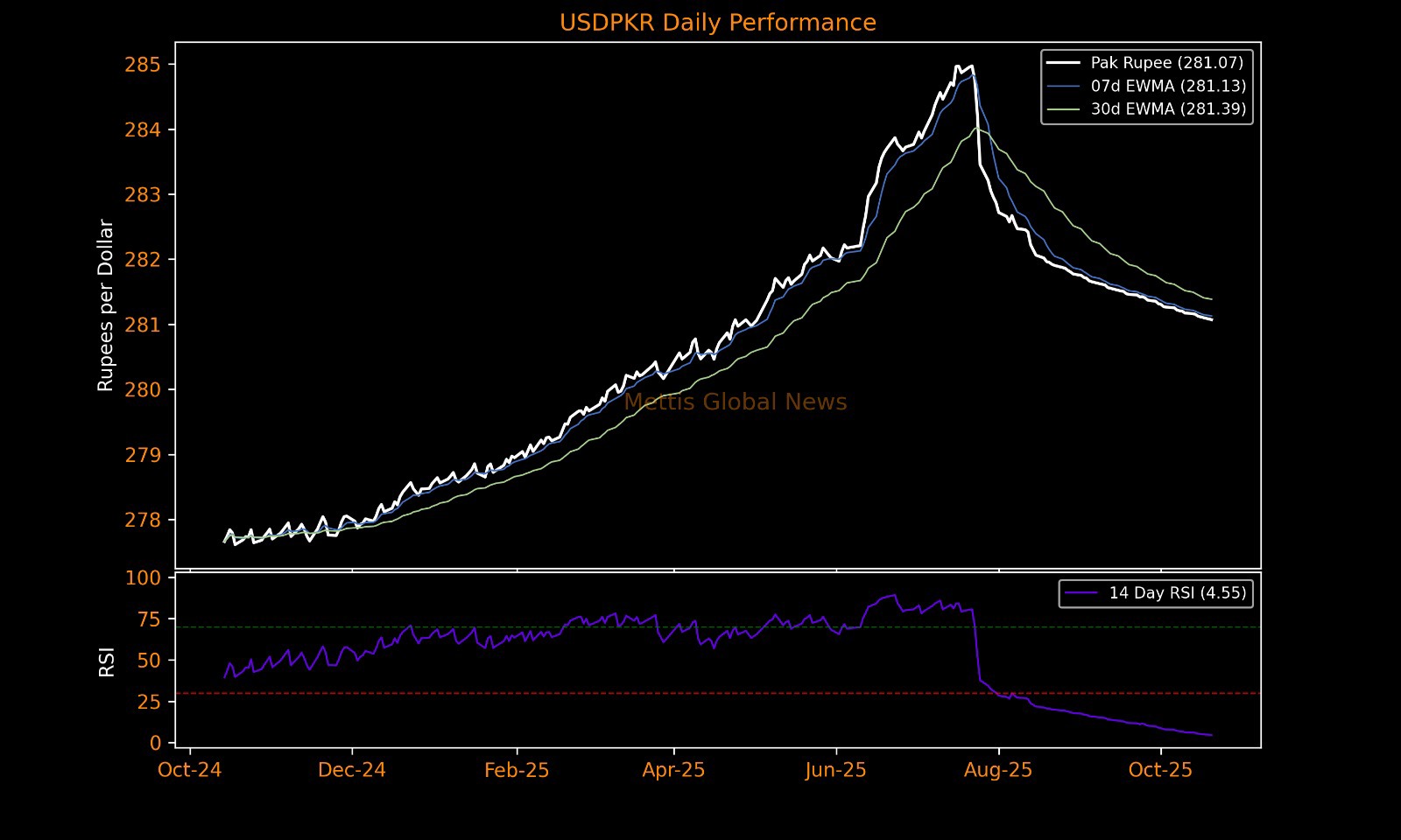 October 20, 2025 (MLN): The Pakistani rupee (PKR) increased by 3.05 paisa against the US dollar in Monday's interbank session to settle the trade at PKR 281.07 per USD, compared to previous closing of 281.10.