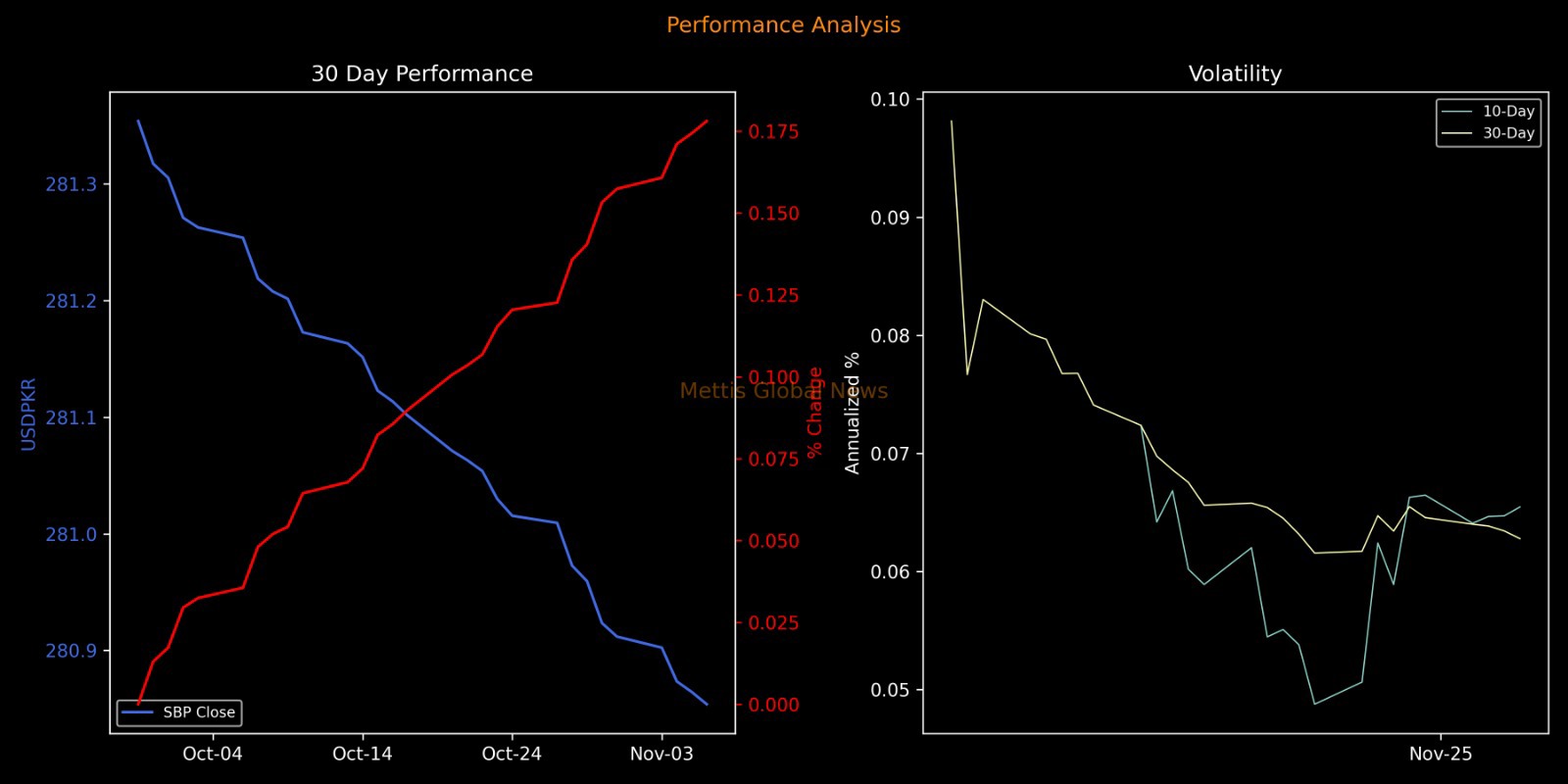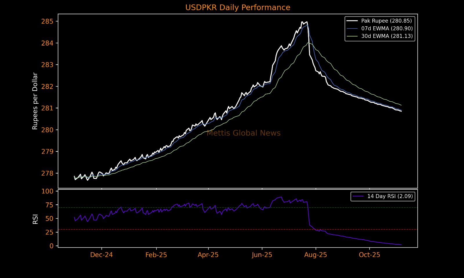 November 06, 2025 (MLN): The Pakistani rupee (PKR) appreciated by 1.05 paisa against the US dollar in Thursday's interbank session to settle the trade at PKR 280.85 per USD, compared to previous closing of 280.86.