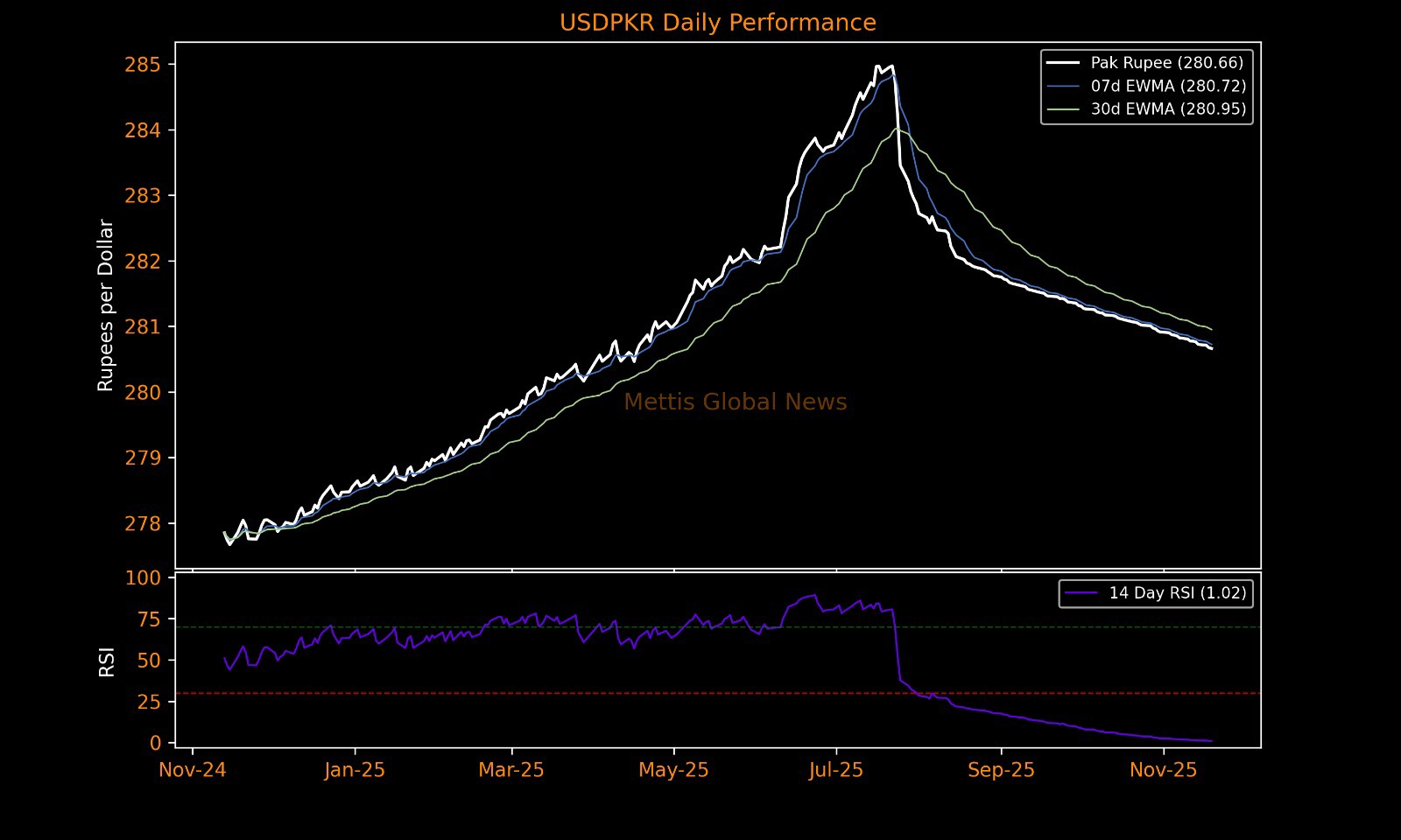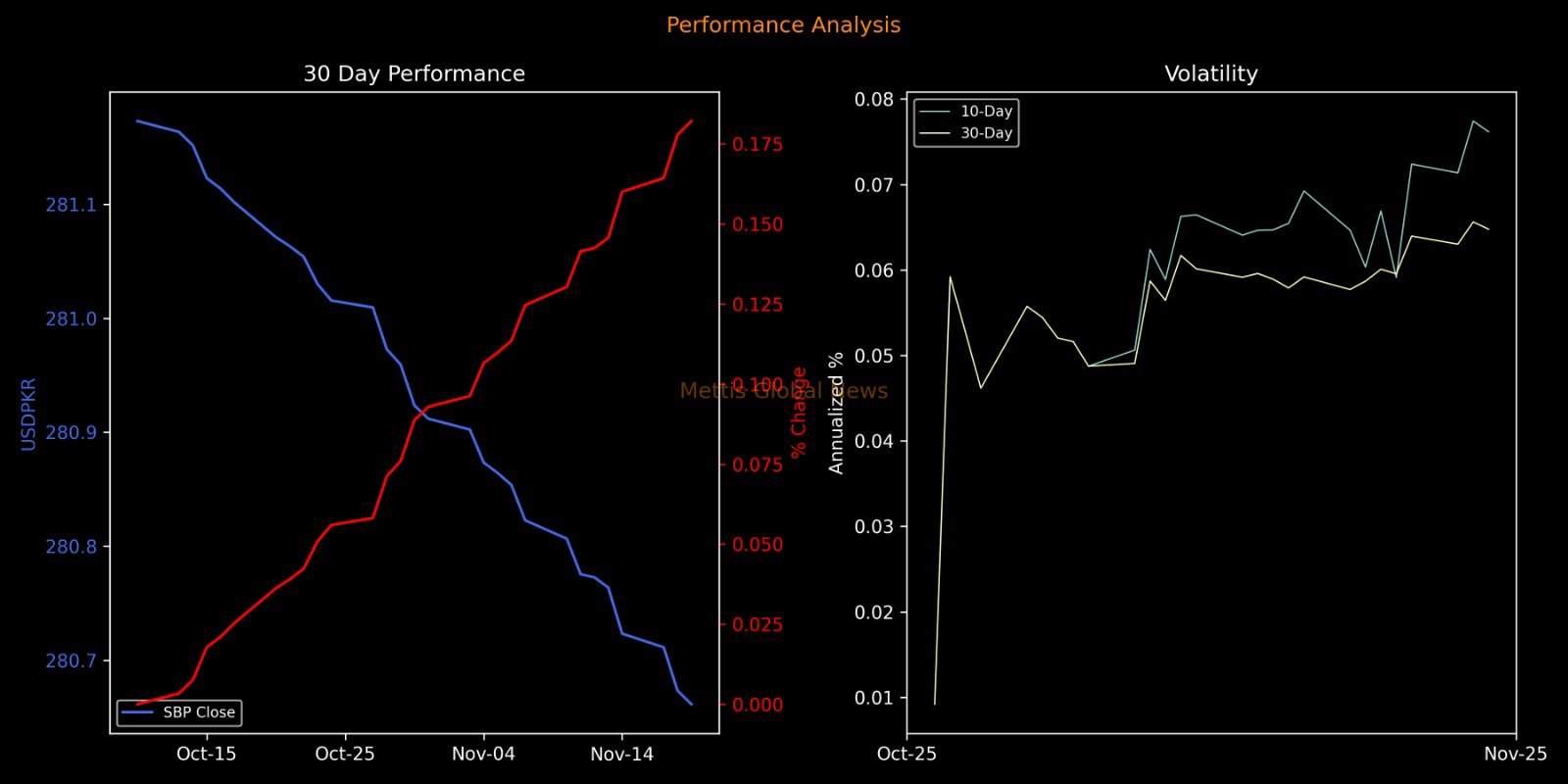 November 19, 2025 (MLN): The Pakistani rupee (PKR) gained by 1.19 paisa against the US dollar in Wednesday's interbank session to settle the trade at PKR 280.66 per USD, compared to previous closing of 280.67.