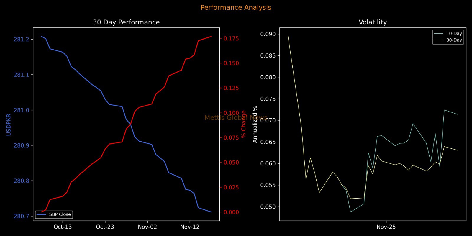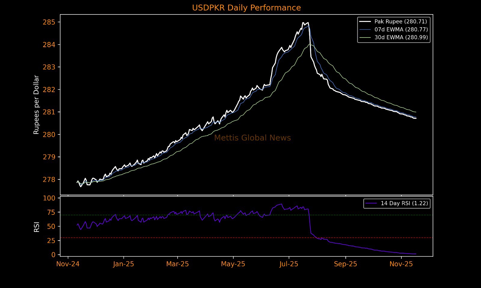 November 17, 2025 (MLN): The Pakistani rupee (PKR) rose by 1.20 paisa against the US dollar in Monday's interbank session to settle the trade at PKR 280.71 per USD, compared to previous closing of 280.72.