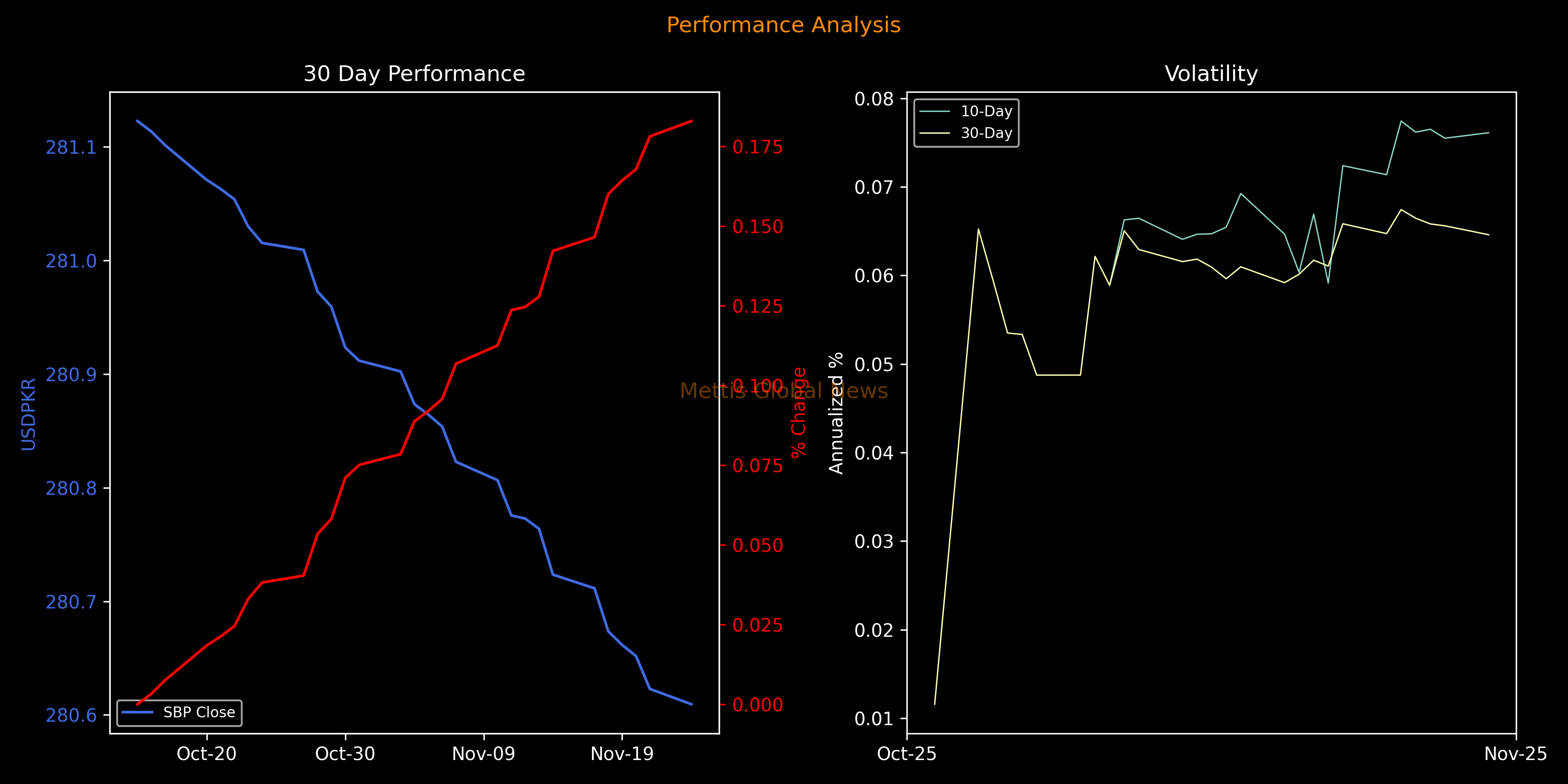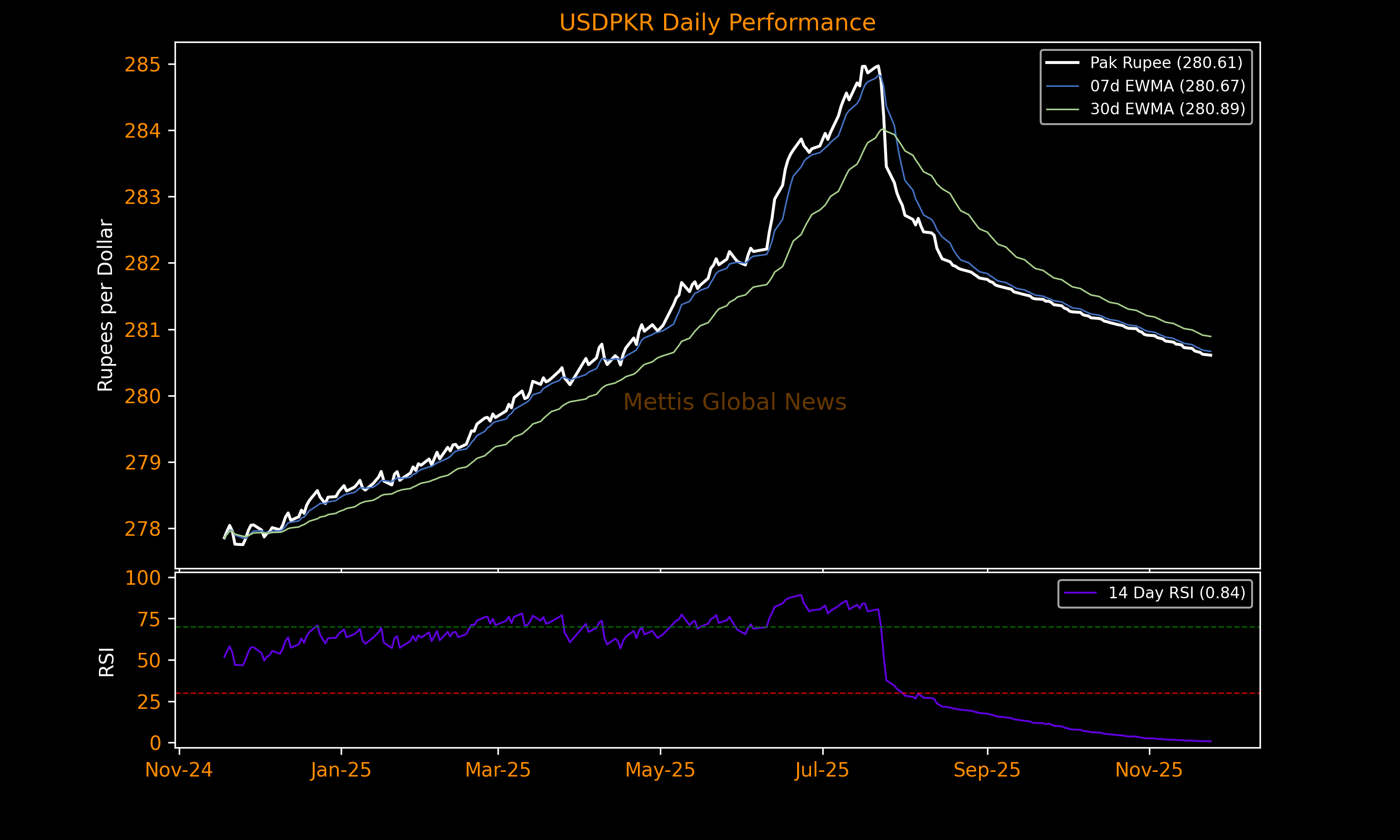 November 24, 2025 (MLN): The Pakistani rupee (PKR) gained by 1.35 paisa against the US dollar in Monday's interbank session to settle the trade at PKR 280.61 per USD, compared to previous closing of 280.62.