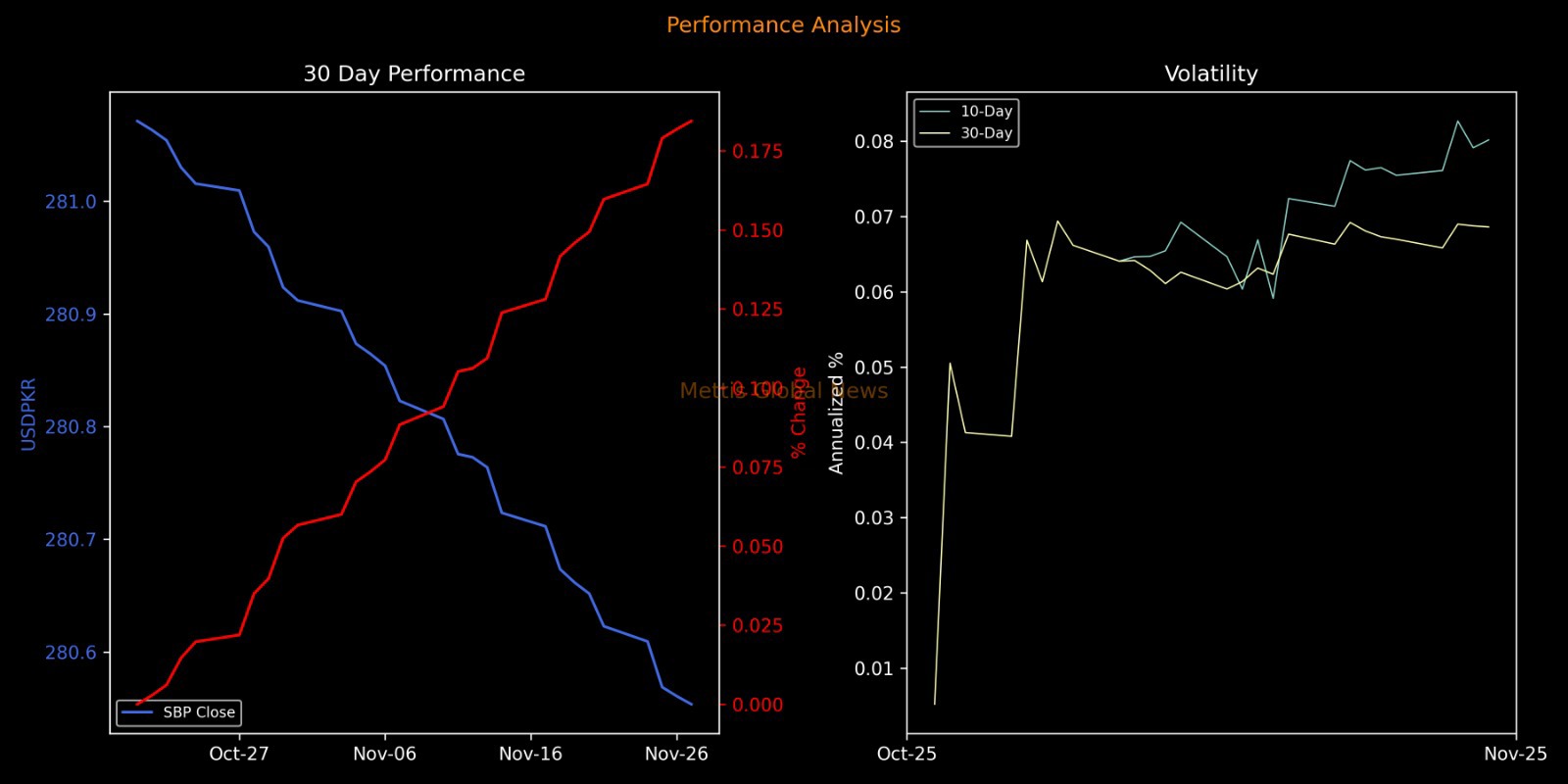During the current fiscal year, PKR has increased against the US Dollar by 3.21 rupees or 1.14%. While it has decreased 2.00 rupees or 0.71% so far this calendar year.