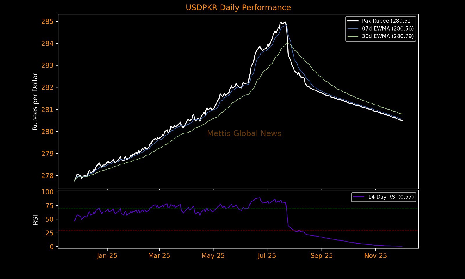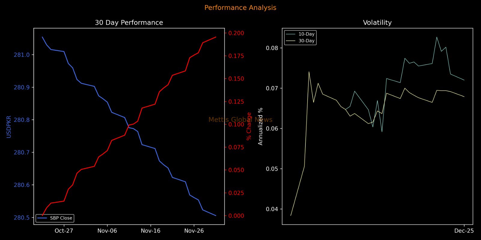 December 01, 2025 (MLN): The Pakistani rupee (PKR) strengthened by 1.75 paisa against the US dollar in Monday's interbank session to settle the trade at PKR 280.51 per USD, compared to previous closing of 280.52.
