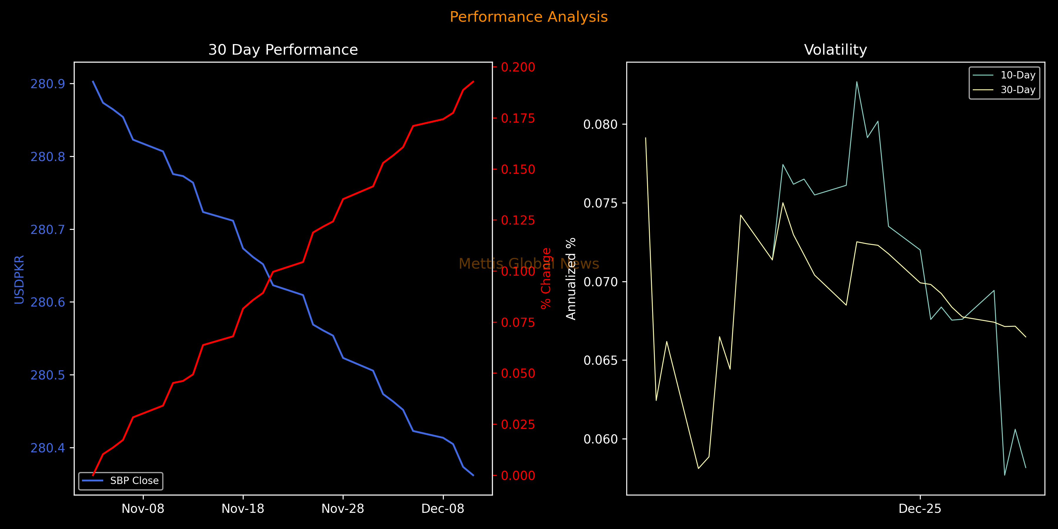 December 11, 2025 (MLN): The Pakistani rupee (PKR) was largely stable, inched up by 1.14 paisa against the US dollar in Thursday's interbank session to settle the trade at PKR 280.36 per USD, compared to previous closing of 280.37.
