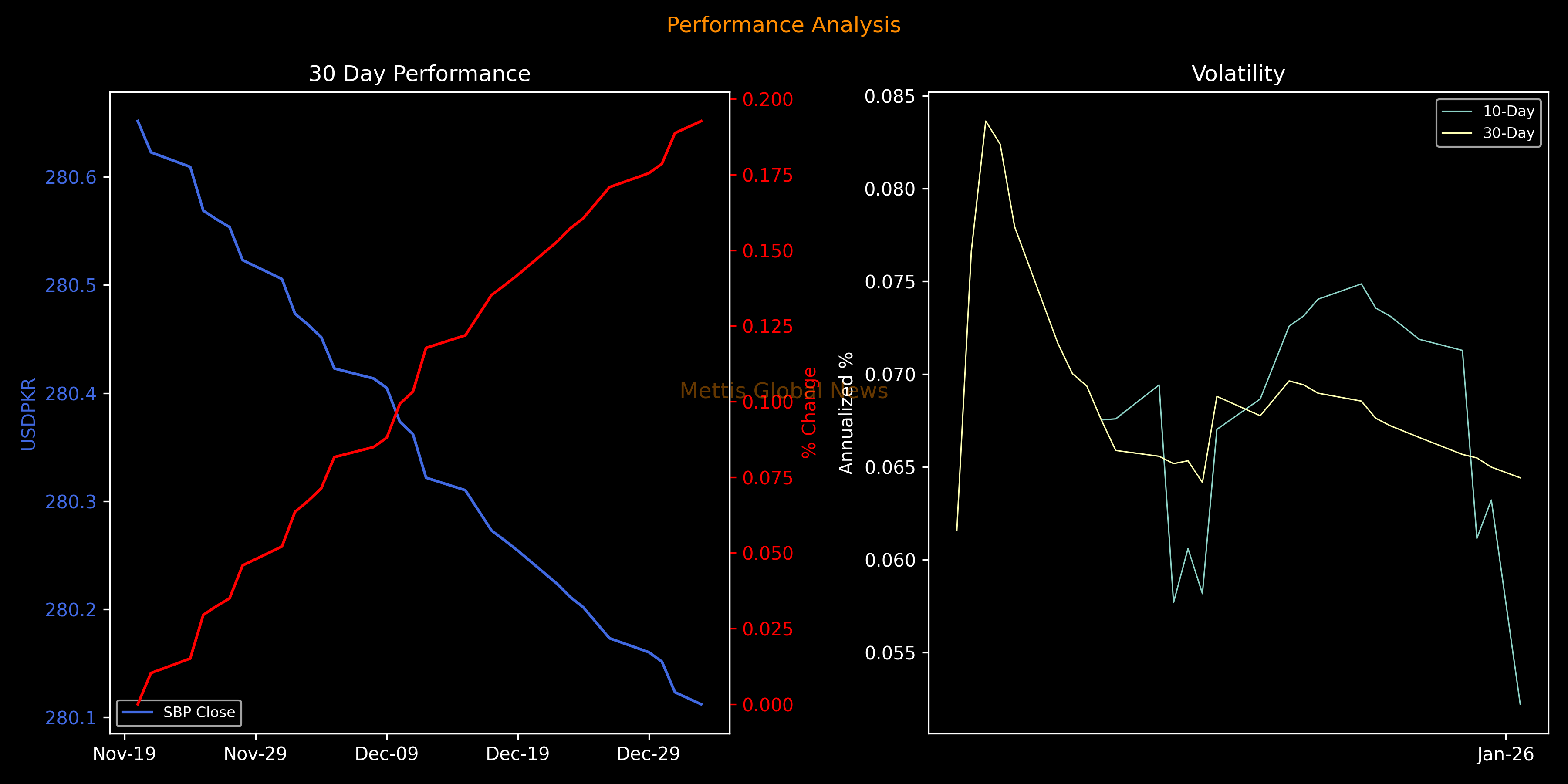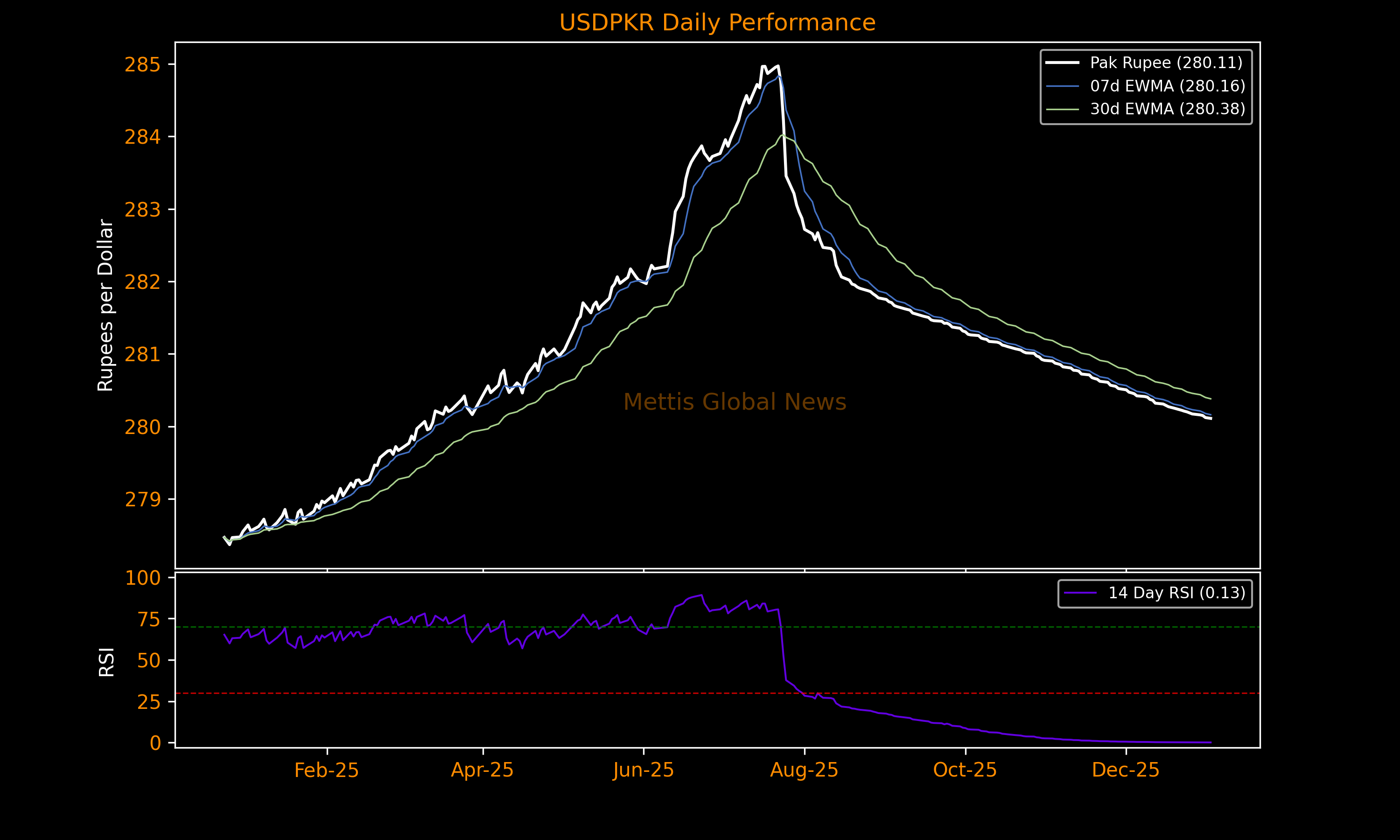 January 02, 2026 (MLN): The Pakistani rupee (PKR) remained mostly flat, slightly appreciated by 1.11 paisa against the US dollar in Friday's interbank session to settle the trade at PKR 280.11 per USD, compared to previous closing of 280.12.