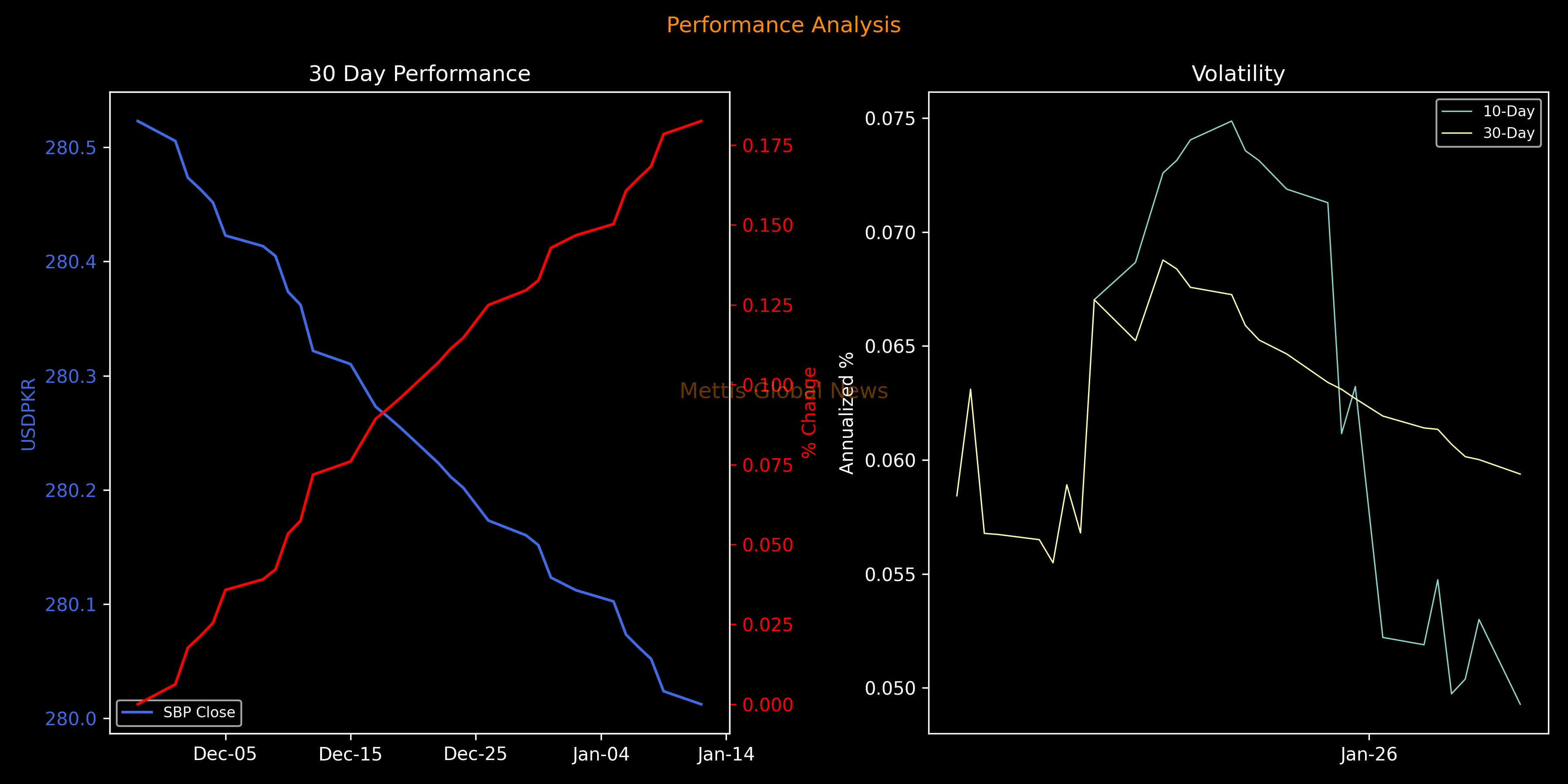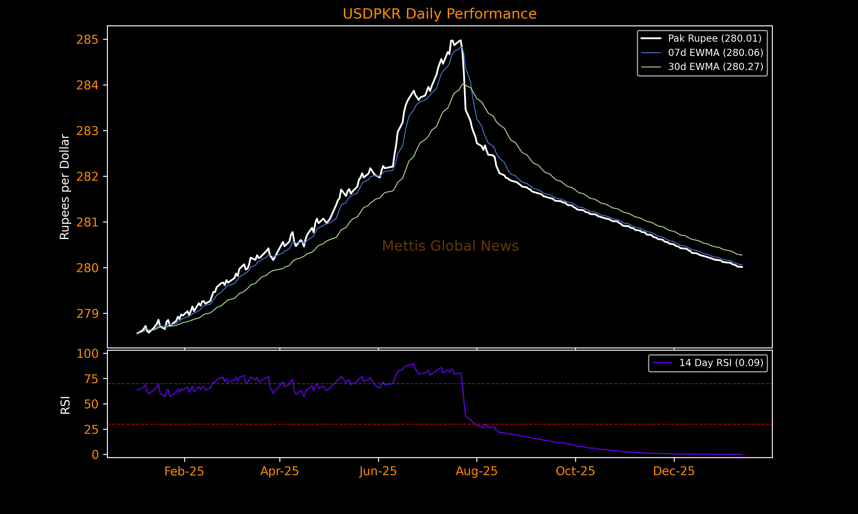 January 12, 2026 (MLN): The Pakistani rupee (PKR) gained by 1.14 paisa against the US dollar in Monday's interbank session to settle the trade at PKR 280.01 per USD, compared to previous closing of 280.02.