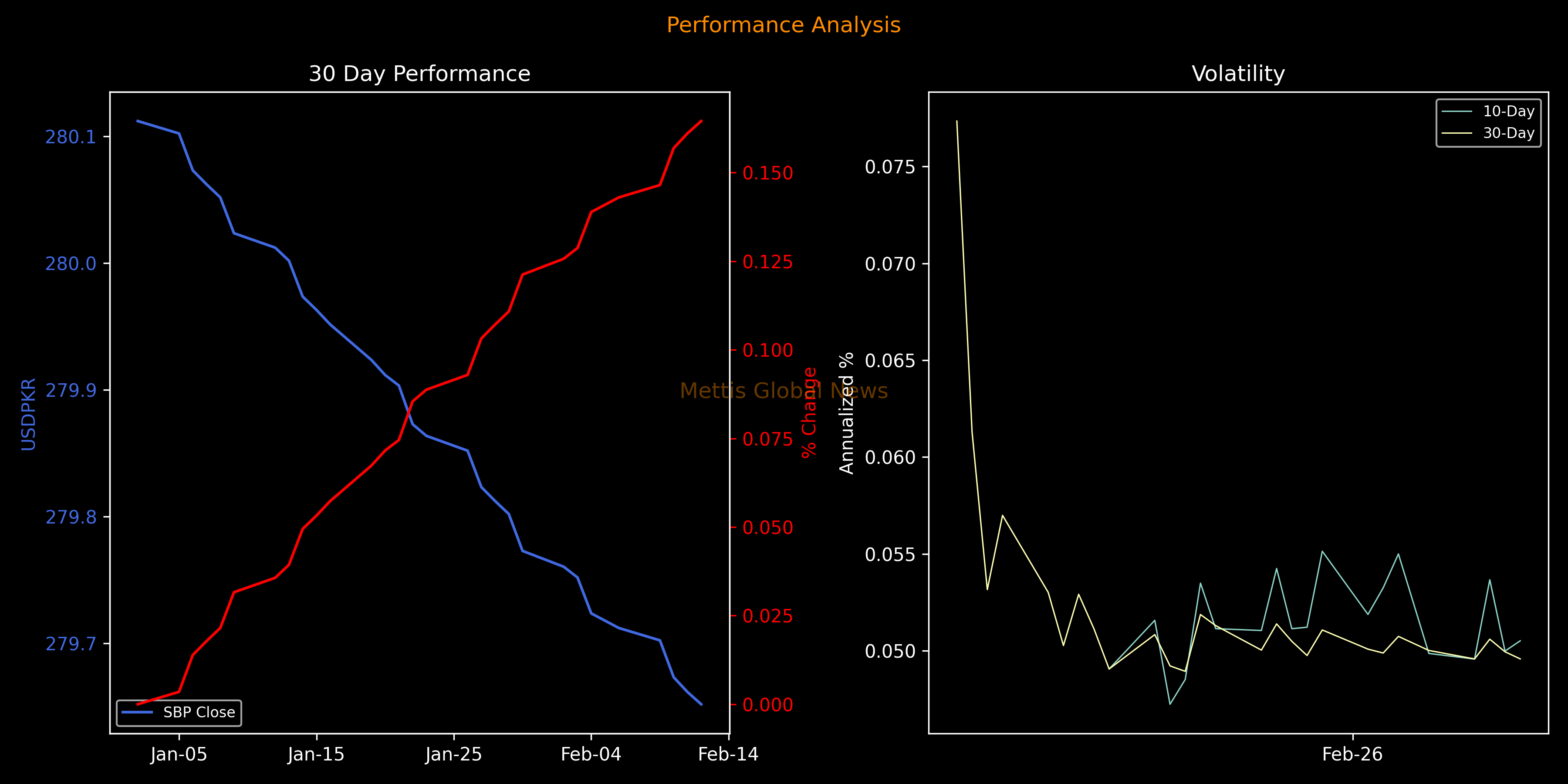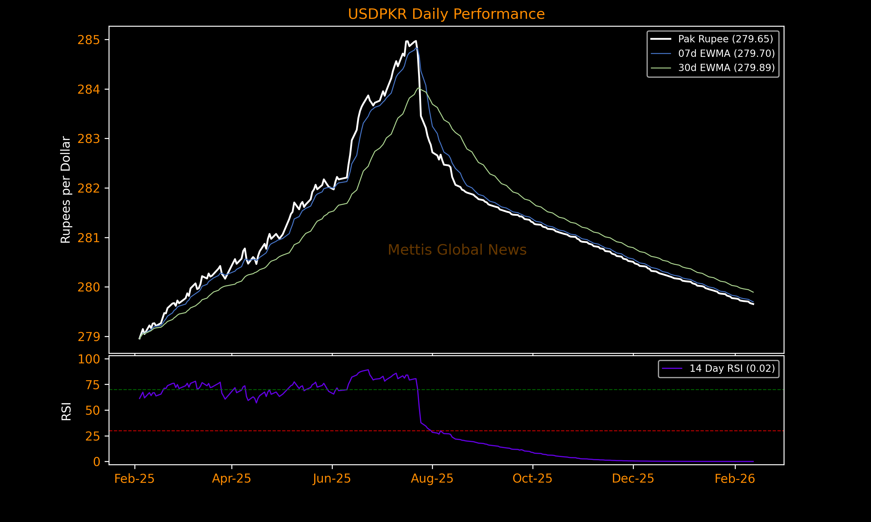 February 12, 2026 (MLN): The Pakistani rupee (PKR) rose by 0.97 paisa against the US dollar in Thursday's interbank session to settle the trade at PKR 279.65 per USD, compared to previous closing of 279.66.
