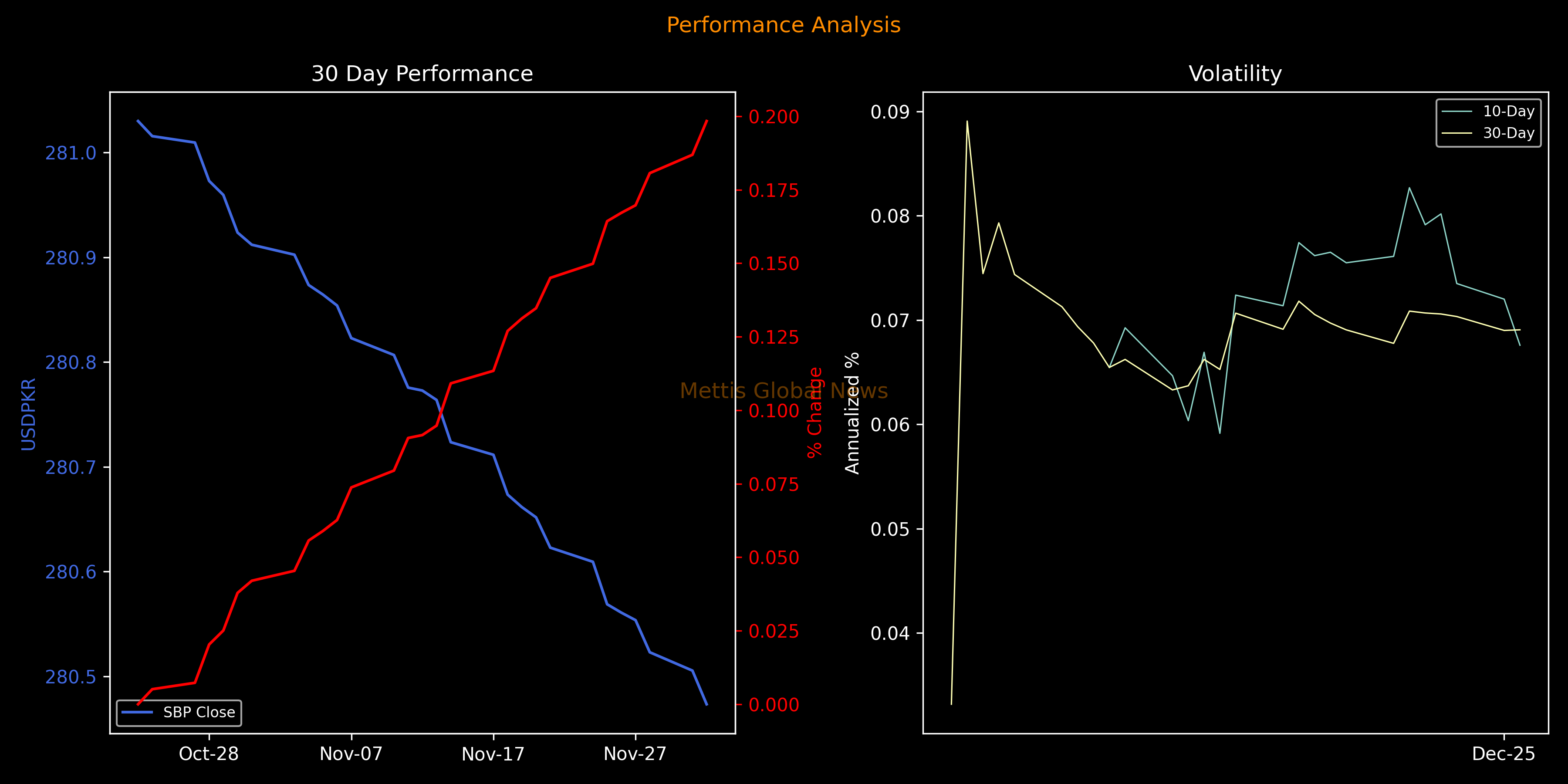December 02, 2025 (MLN): The Pakistani rupee (PKR) strengthened by 3.21 paisa or 0.01% against the US dollar in Tuesday's interbank session to settle the trade at PKR 280.47 per USD, compared to the previous closing of 280.51.