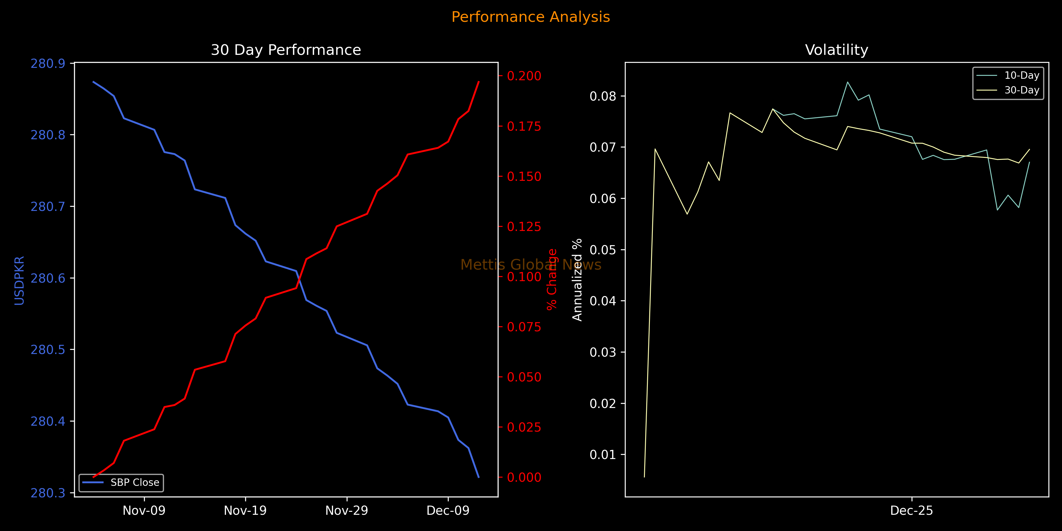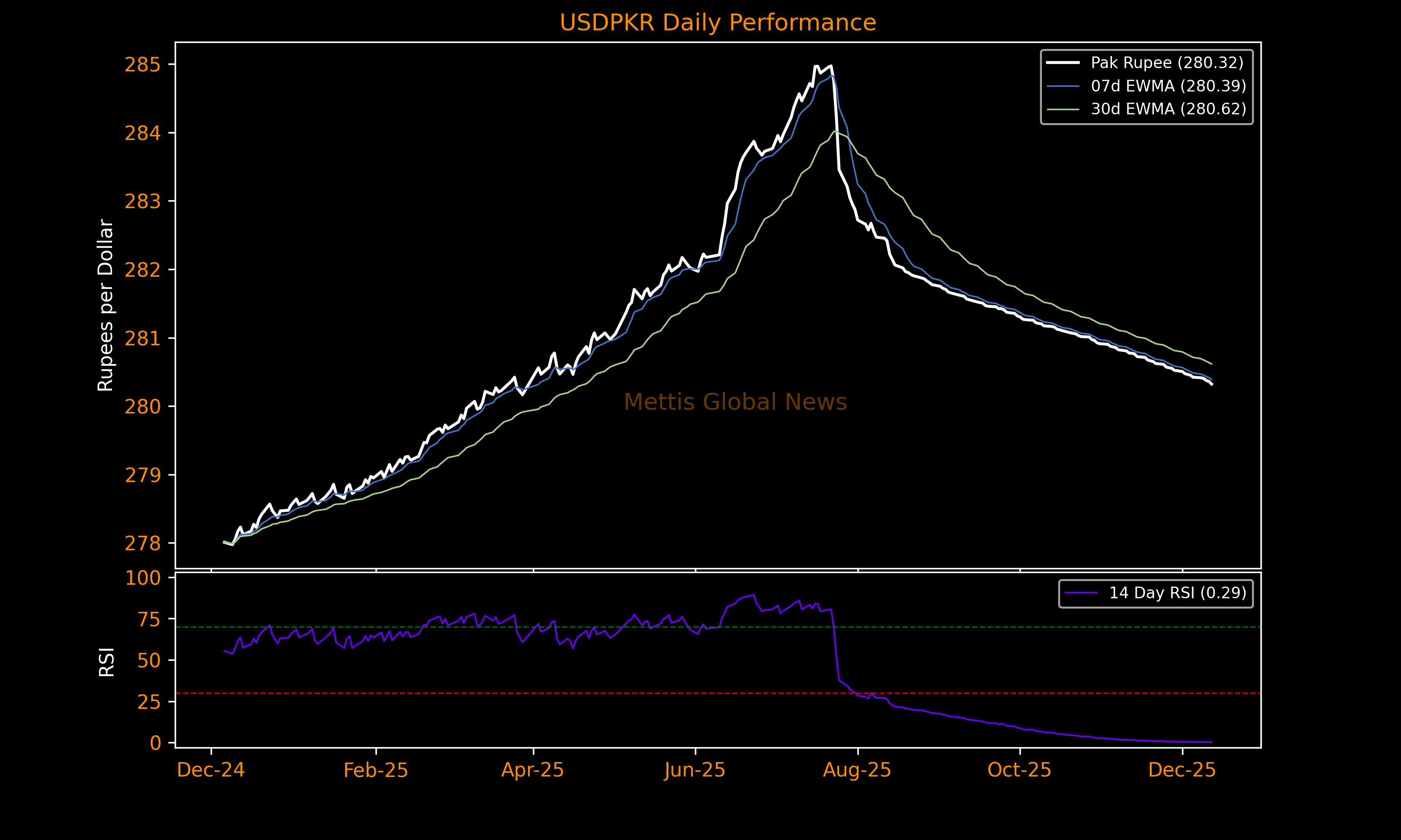 December 12, 2025 (MLN): The Pakistani rupee (PKR) strengthened by 4.04 paisa against the US dollar in Friday's interbank session to settle the trade at PKR 280.32 per USD, compared to previous closing of 280.36.