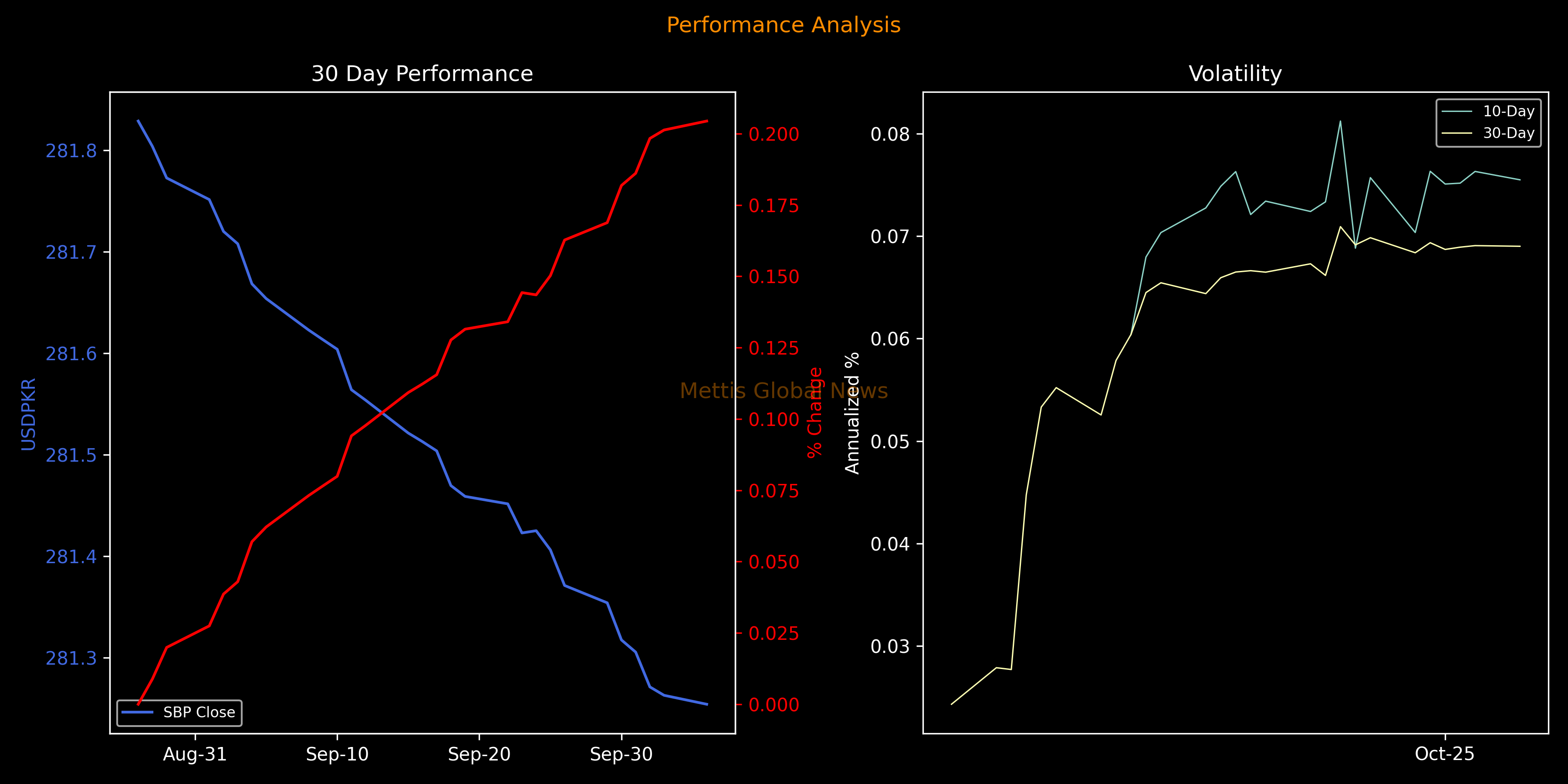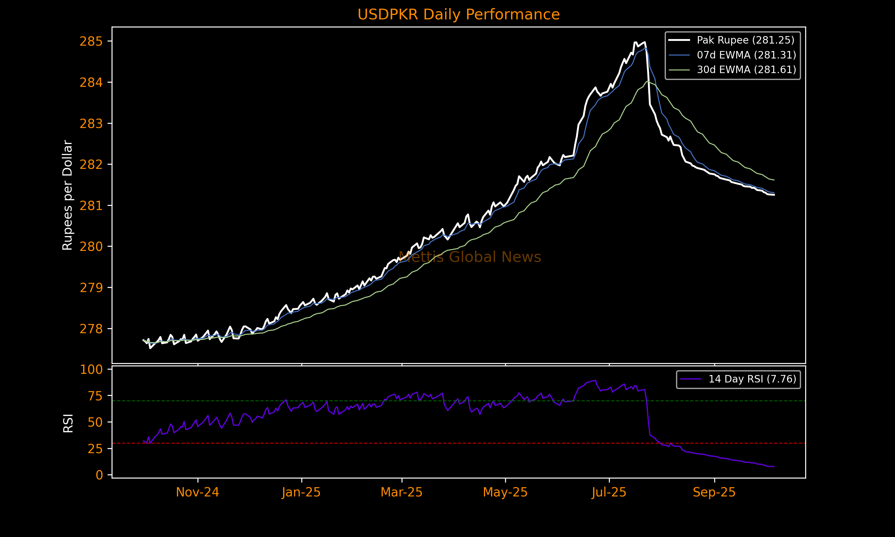October 06, 2025 (MLN): The Pakistani rupee (PKR) strengthened by 0.88 paisa against the US dollar in Monday's interbank session to settle the trade at PKR 281.25 per USD, compared to the previous closing of 281.26.
