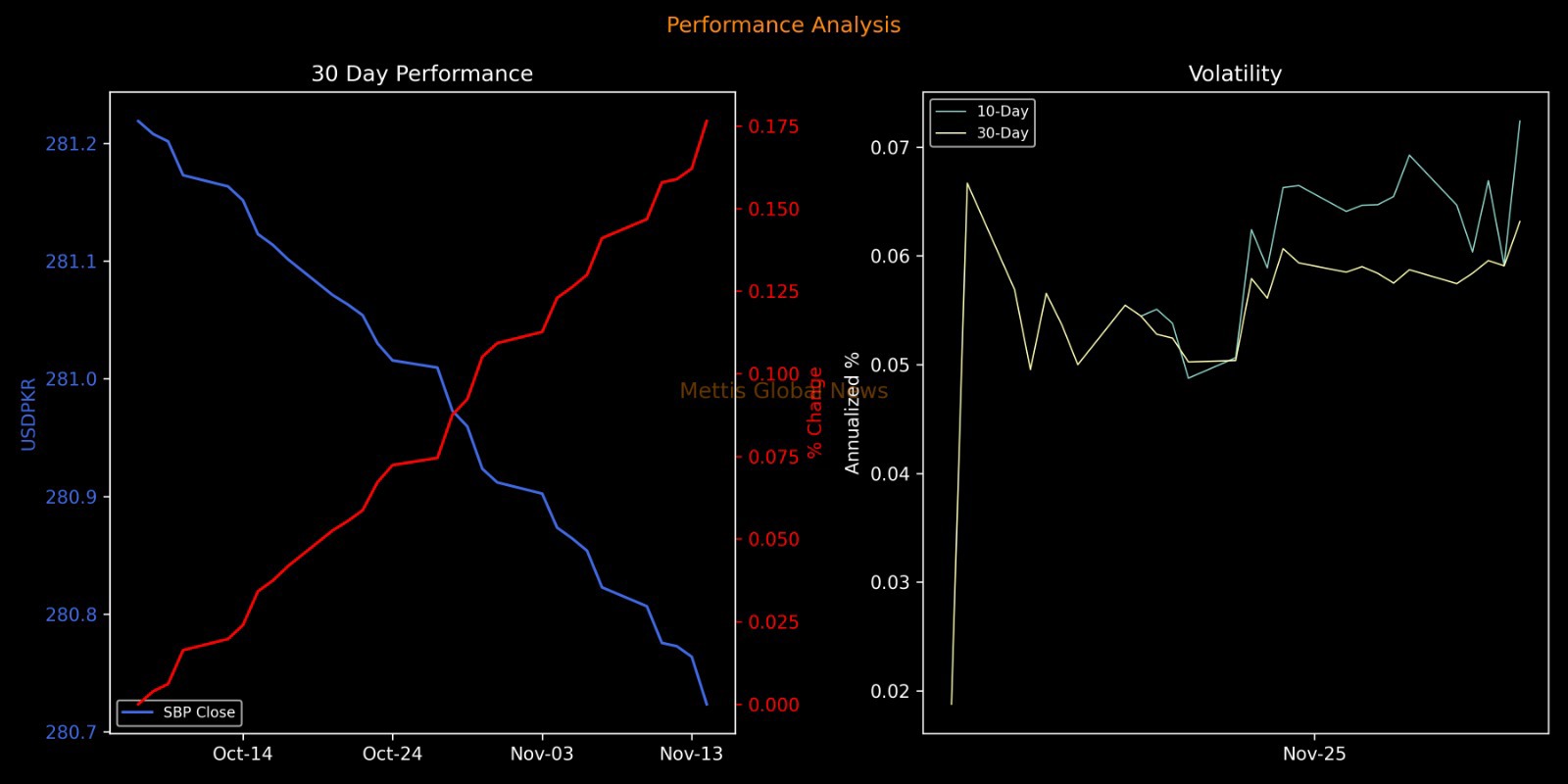 November 14, 2025 (MLN): The Pakistani rupee (PKR) gained by 4.03 paisa against the US dollar in Friday's interbank session to settle the trade at PKR 280.72 per USD, compared to previous closing of 280.76.