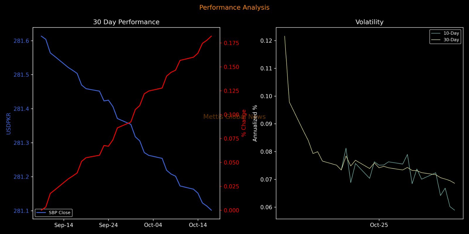 October 17, 2025 (MLN): The Pakistani rupee (PKR) gained by 1.21 paisa against the US dollar in Friday's interbank session to settle the trade at PKR 281.10 per USD, compared to previous closing of 281.11.