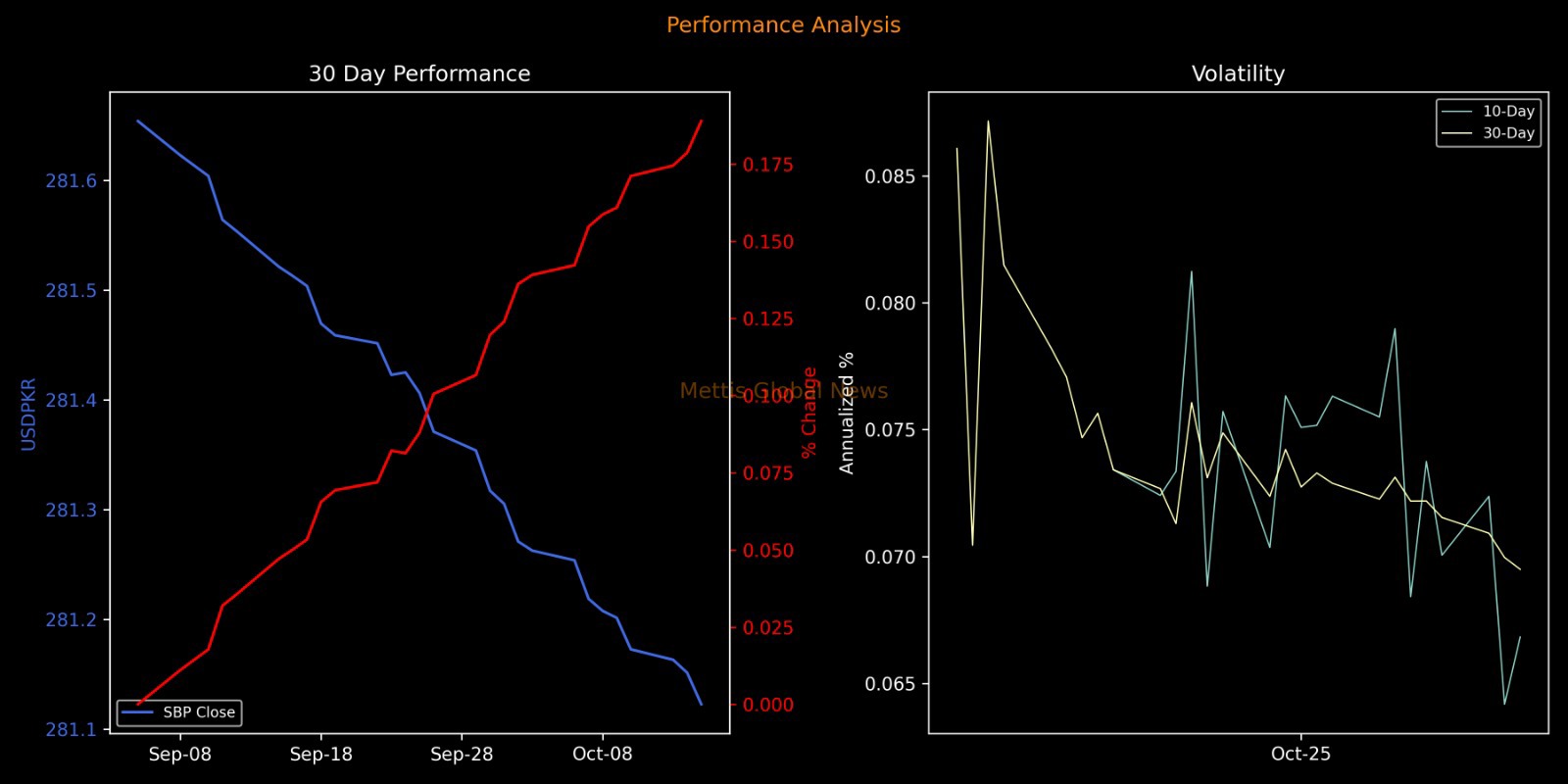 October 15, 2025 (MLN): The Pakistani rupee (PKR) increased by 2.87 paisa or 0.01% against the US dollar in Wednesday's interbank session to settle the trade at PKR 281.12 per USD, compared to previous closing of 281.15.