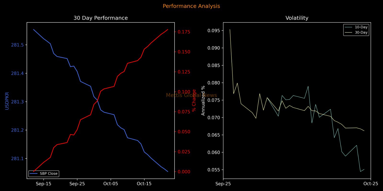 October 22, 2025 (MLN): The Pakistani rupee (PKR) appreciated by 0.92 paisa against the US dollar in Wednesday's interbank session to settle the trade at PKR 281.05 per USD, compared to previous closing of 281.06.