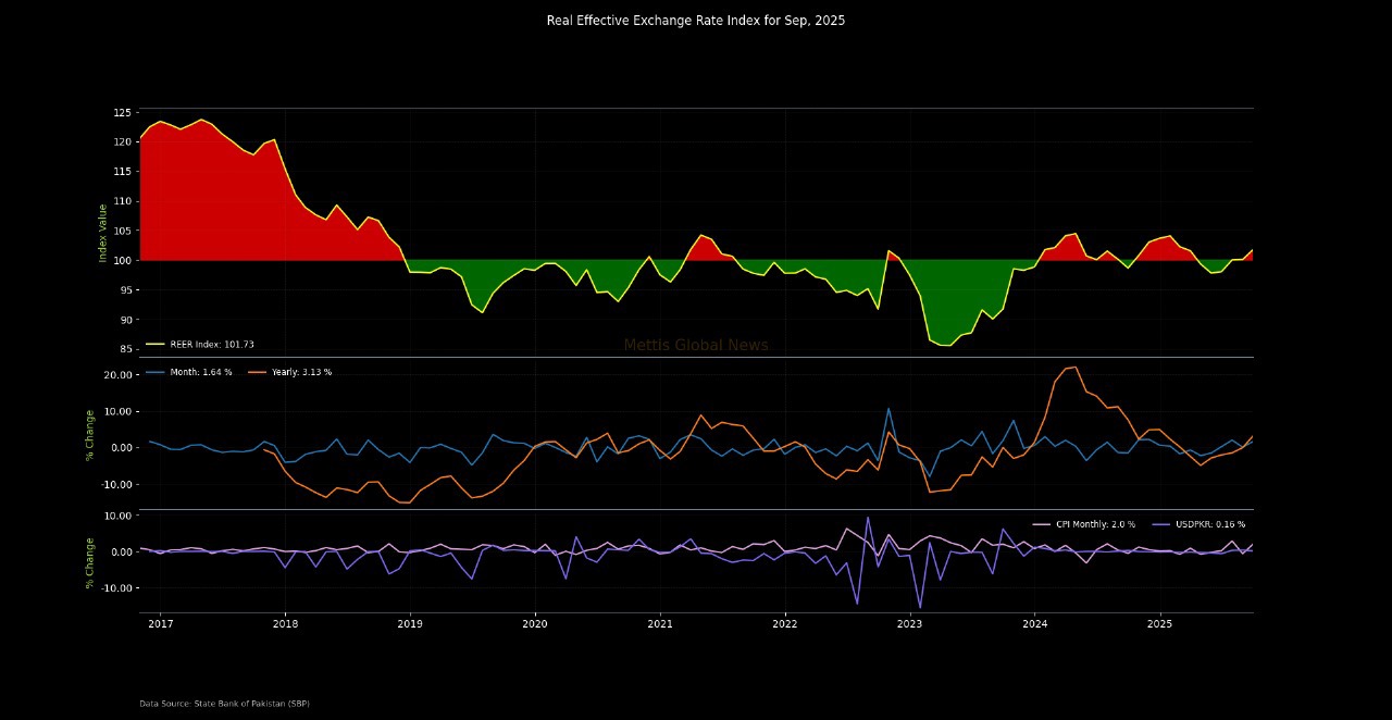 October 20, 2025 (MLN): Pakistan’s Real Effective Exchange Rate (REER) index increased by 1.64% MoM in September 2025 to 101.73, compared to 100.01 in August 2025, data from the State Bank of Pakistan (SBP) revealed.