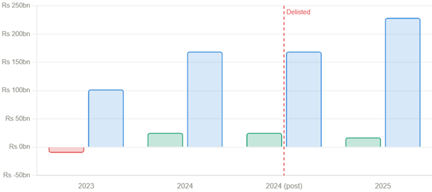 Add the cumulative profits earned in the two years since delisting, Rs25.2 billion in 2024 and Rs17.2 billion in 2025, totalling Rs42.4 billion, or