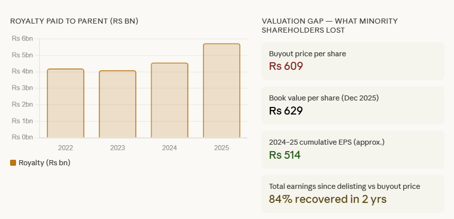 Note 32.1.3 in the 2025 financial statements confirms the royalty arrangement remains unchanged in structure. What has changed is the scale, because the revenue base has grown. That is precisely the upside that minorities were denied.