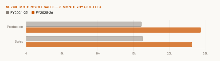~84,000 units — 63% above the delisting-year base. Motorcycle sales have jumped