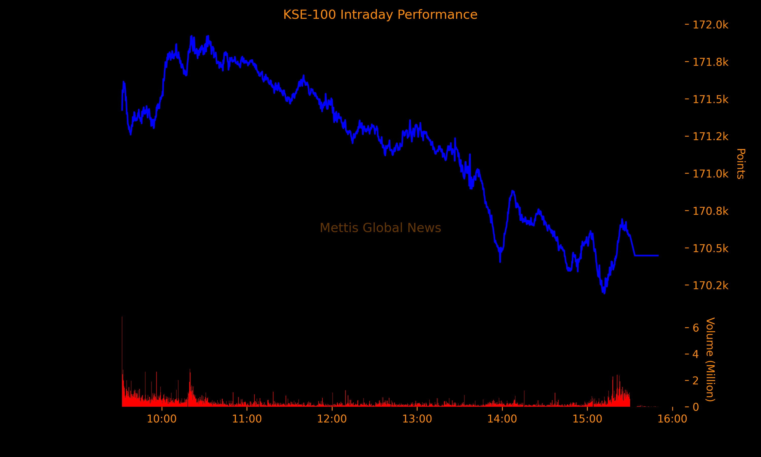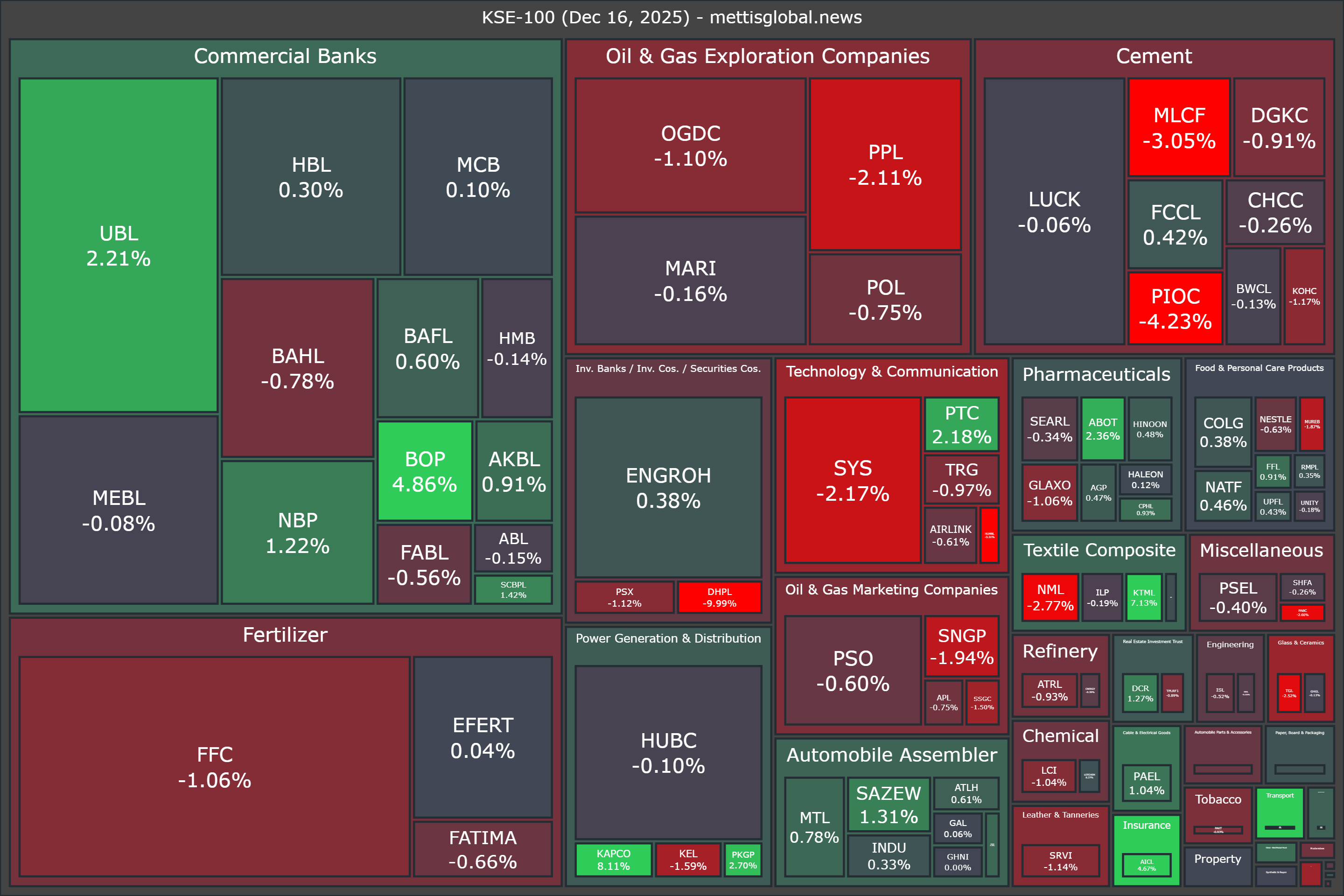 December 16, 2025 (MLN): The benchmark KSE-100 Index concluded Tuesday's trading session at 170,447.29, showing a decrease of 294.05 points or 0.17%.