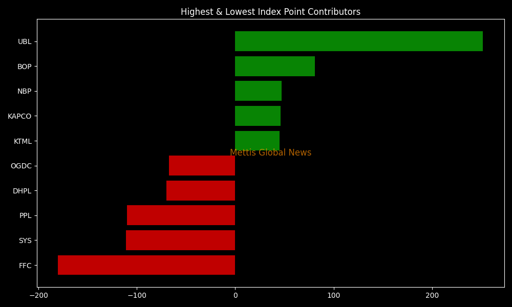 Meanwhile, companies that added points to the index were UBL (+251.96pts), BOP (+80.95pts), NBP (+47.05pts), KAPCO (+45.87pts), and KTML (+44.85pts).