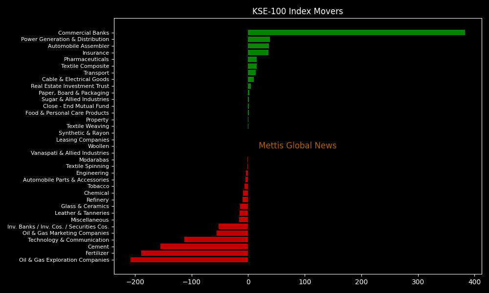 While the index was supported by Commercial Banks (+383.12pts), Power Generation & Distribution (+38.45pts), Automobile Assembler (+36.81pts), Insurance (+36.24pts), and Pharmaceuticals (+14.89pts).