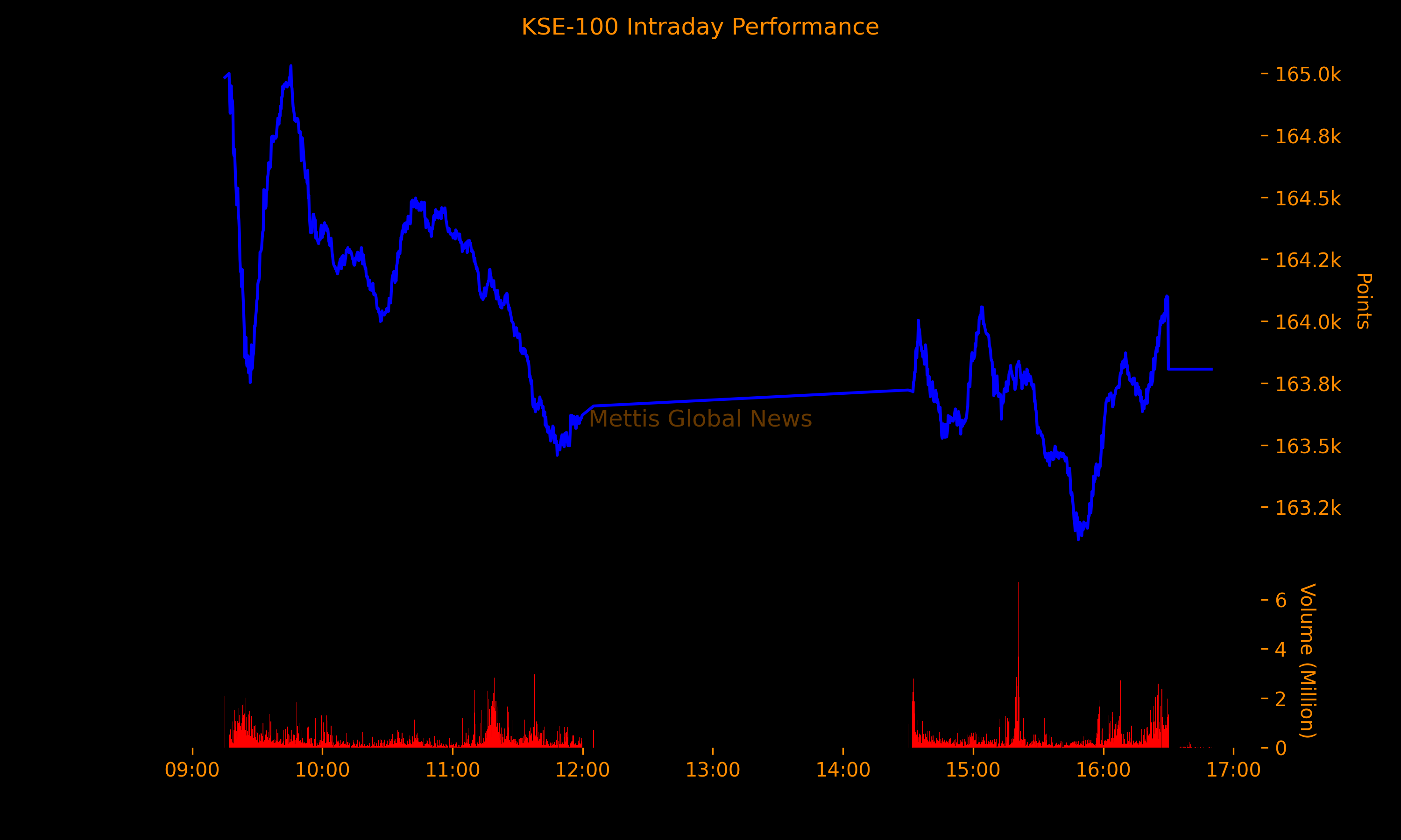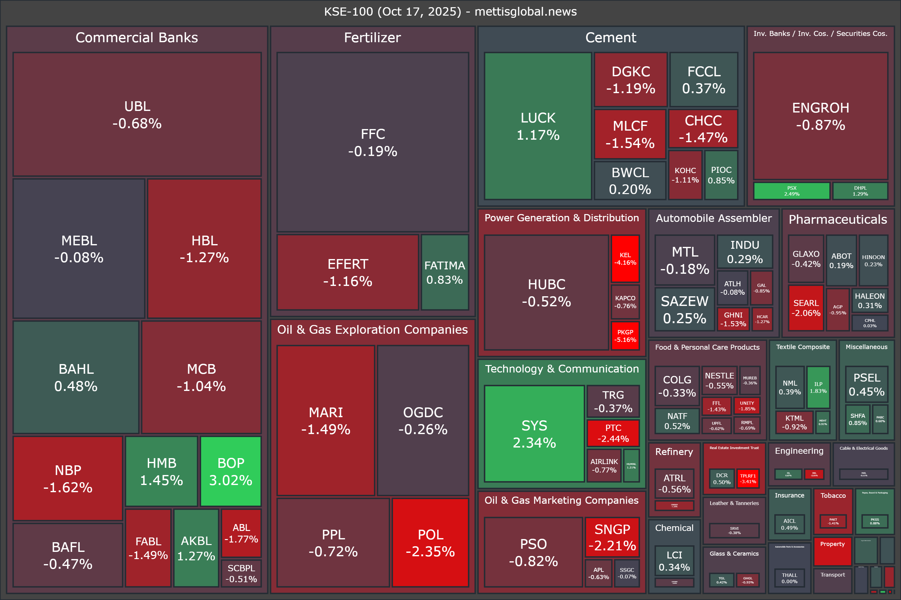 October 17, 2025 (MLN): The benchmark KSE-100 Index concluded Friday's trading session at 163,806.21, showing a decrease of 638.50 points or 0.39%.