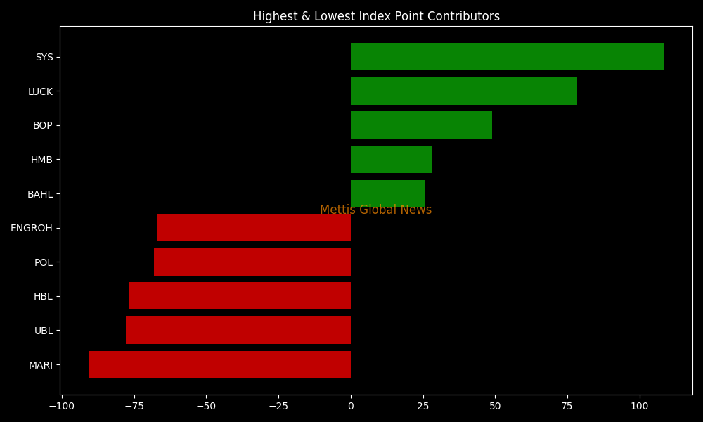 In terms of index-point contributions, companies that dragged the index lower were MARI (-90.66pts), UBL (-77.93pts), HBL (-76.67pts), POL (-68.10pts), and ENGROH (-67.16pts).