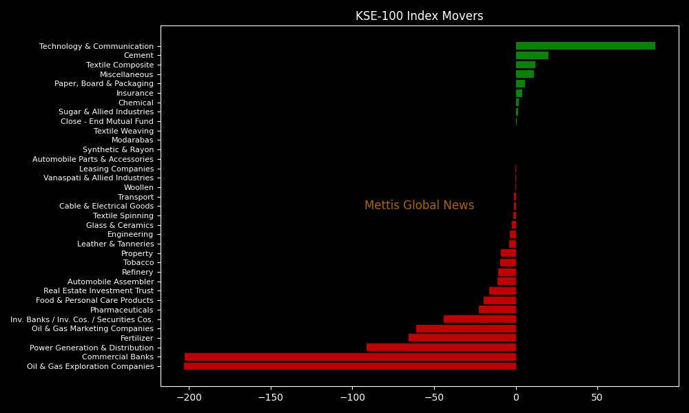 Sector-wise, KSE-100 Index was let down by Oil & Gas Exploration Companies (-203.07pts), Commercial Banks (-202.55pts), Power Generation & Distribution (-91.42pts), Fertilizer (-65.62pts), and Oil & Gas Marketing Companies (-61.06pts).