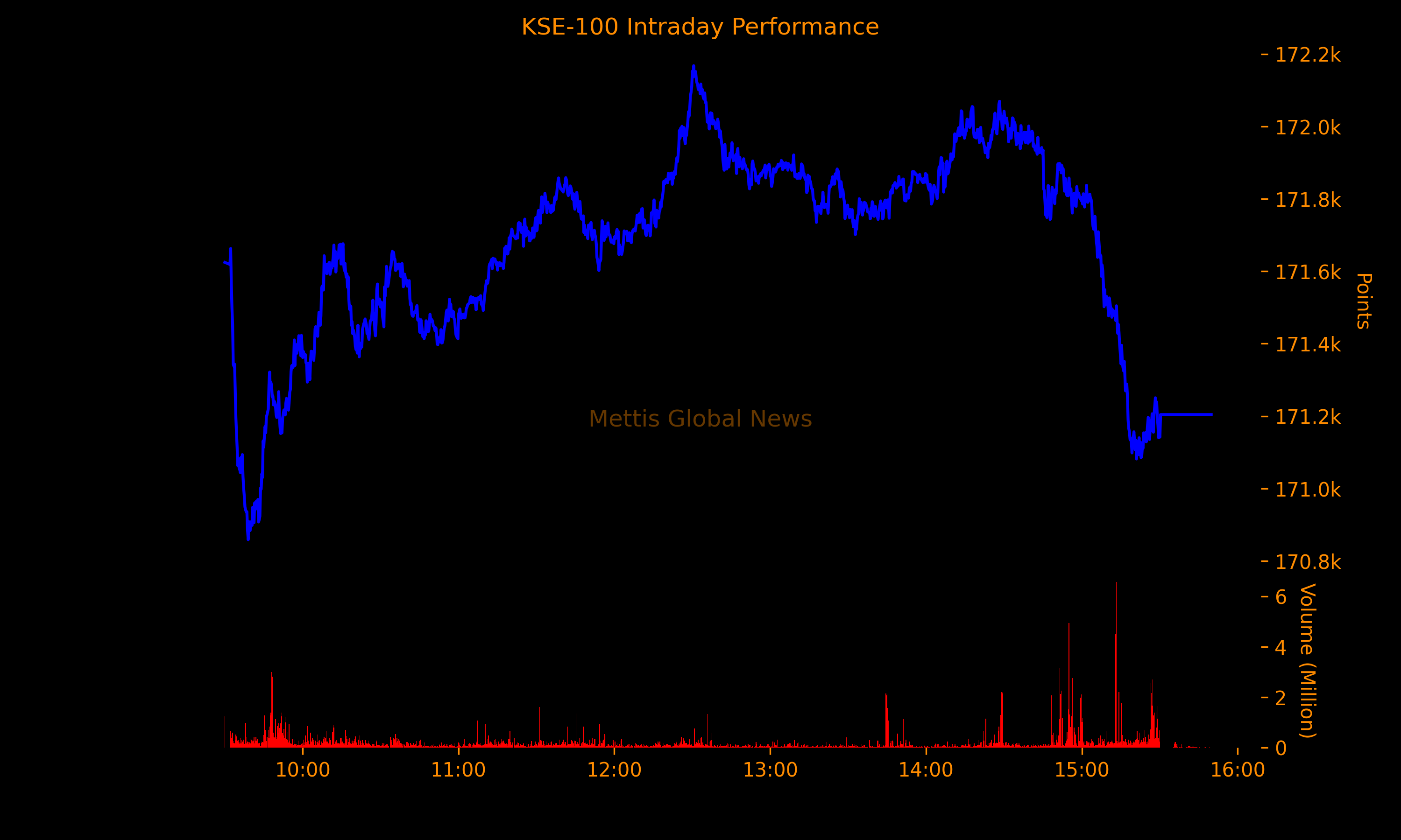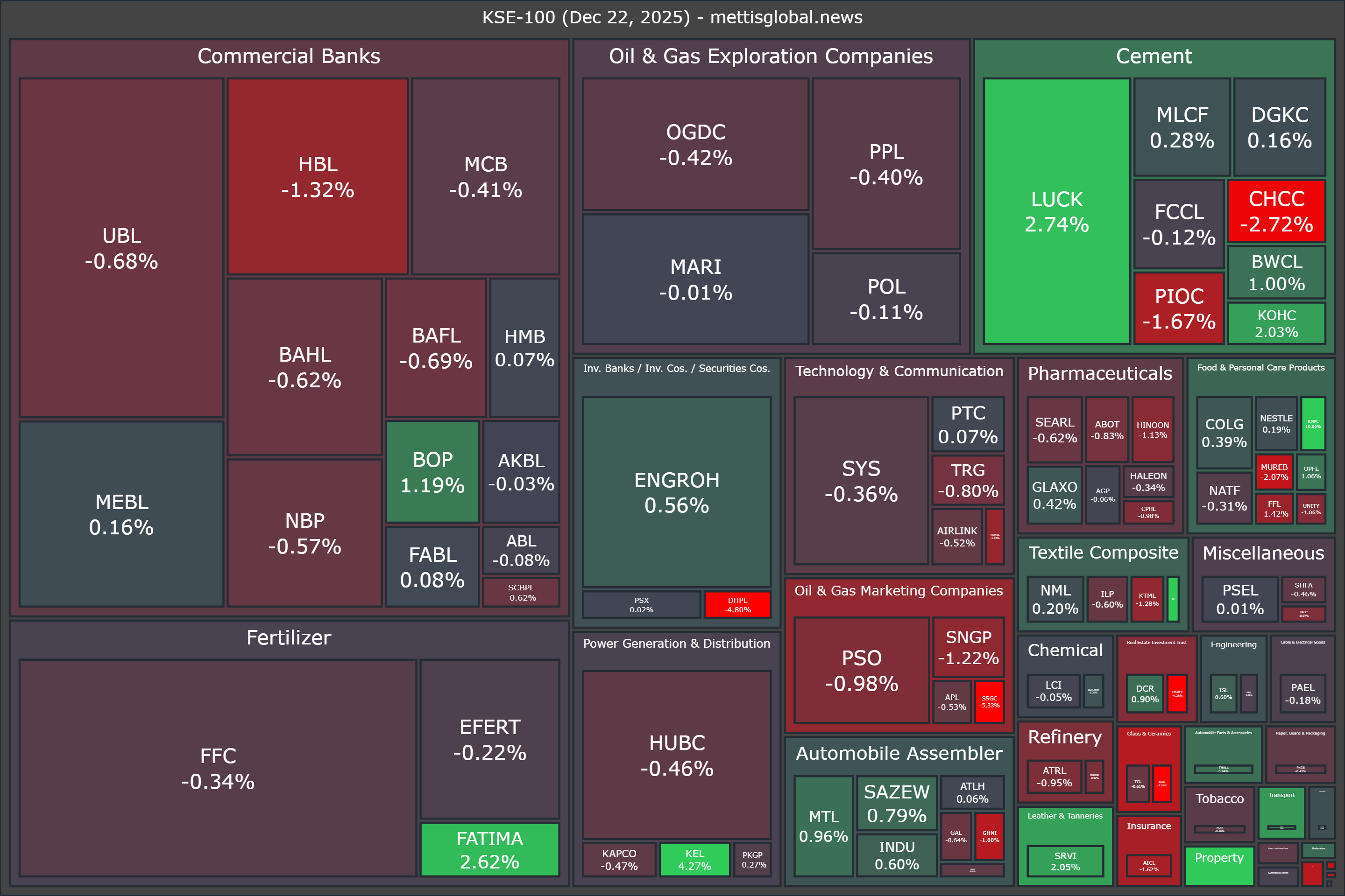 December 22, 2025 (MLN): The benchmark KSE-100 Index concluded Monday's trading session at 171,204.17, showing a decrease of 200.31 points or 0.12%.