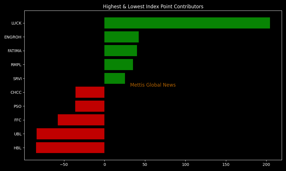 Meanwhile, companies that added points to the index were LUCK (+204.48pts), ENGROH (+42.33pts), FATIMA (+40.34pts), RMPL (+35.27pts), and SRVI (+25.21pts).