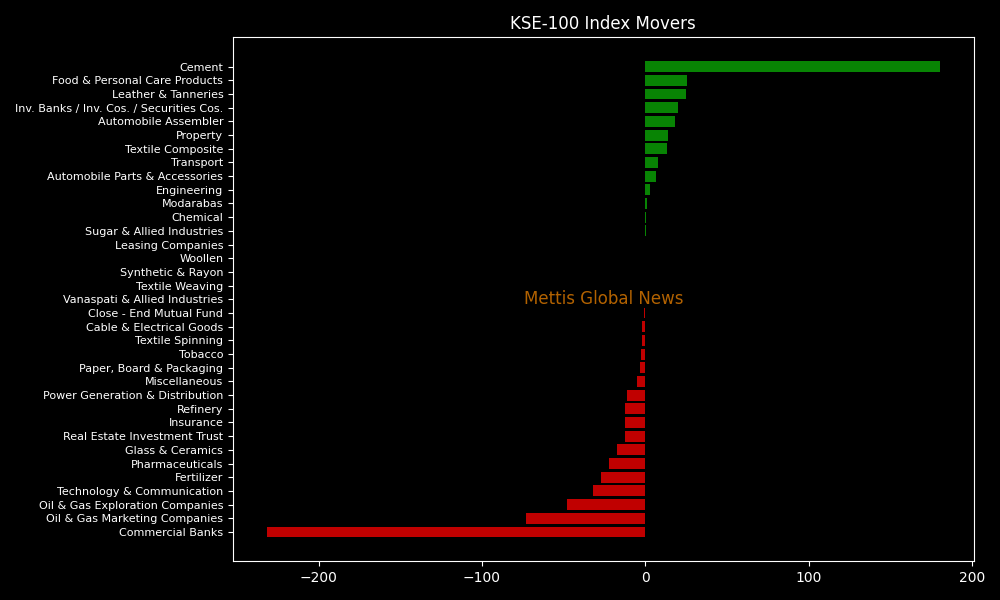 Sector-wise, KSE-100 Index was let down by Commercial Banks (-231.75pts), Oil & Gas Marketing Companies (-72.91pts), Oil & Gas Exploration Companies (-47.81pts), Technology & Communication (-32.00pts), and Fertilizer (-27.06pts).
