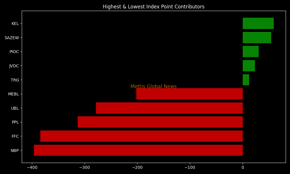 In terms of index-point contributions, companies that dragged the index lower were NBP (-396.37pts), FFC (-383.97pts), PPL (-312.81pts), UBL (-278.30pts), and MEBL (-201.66pts).