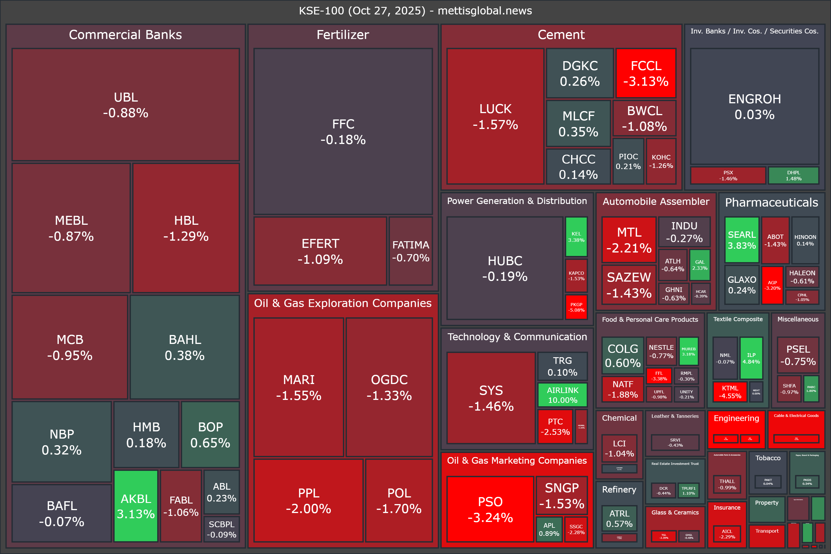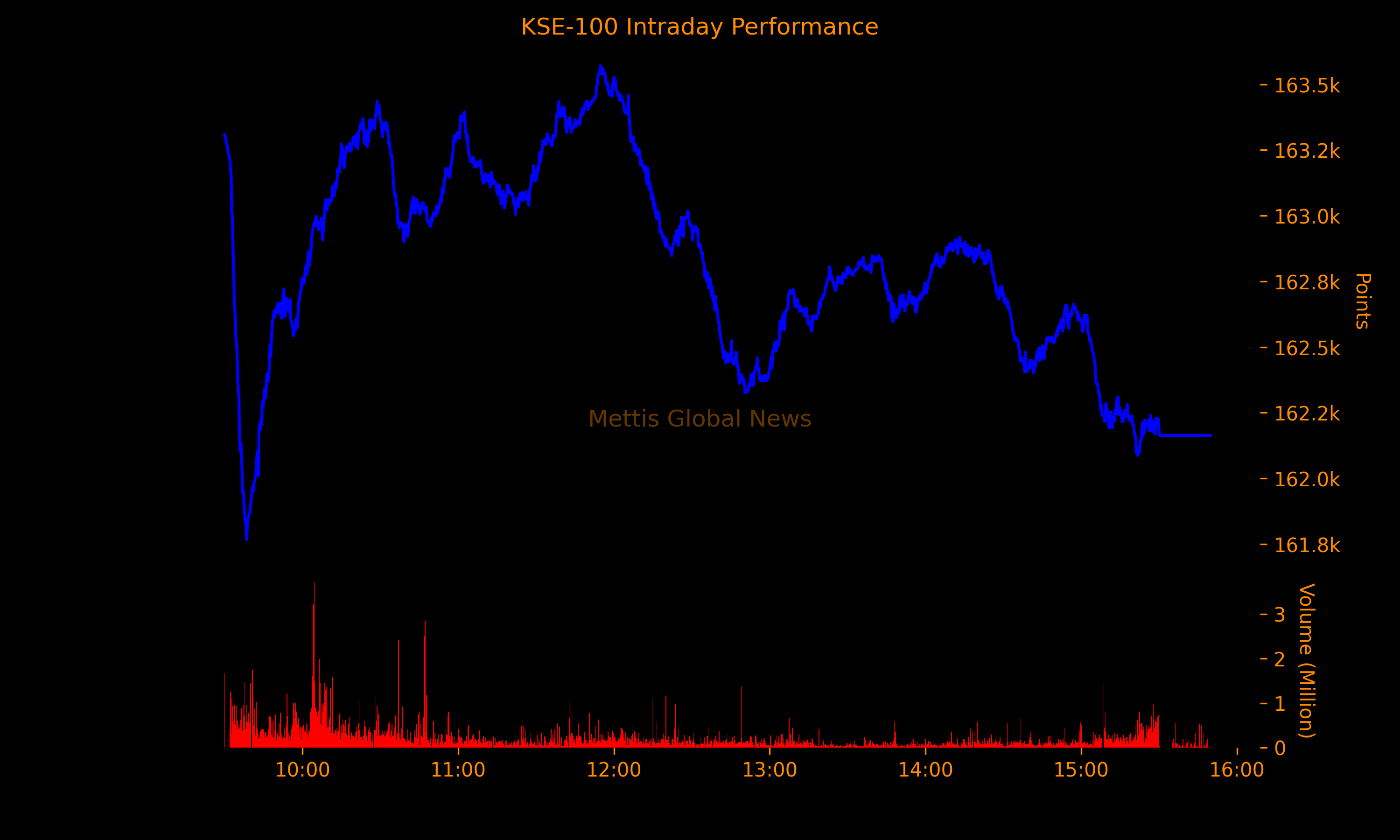 October 27, 2025 (MLN): The benchmark KSE-100 Index concluded Monday's trading session at 162,163.81, showing a decrease of 1,140.32 points or 0.70%.